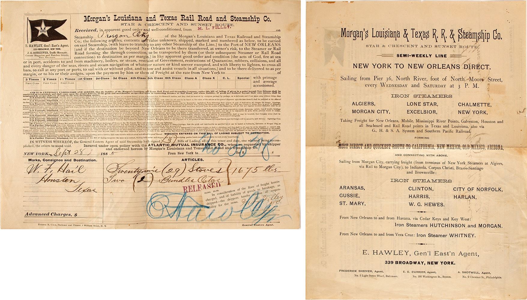 This is one piece. The paper has a broadside 12 x 9.5". It advertises the Steamship rout from New York to New Orleans that runs semi-weekly. THe stamers include the Algiers, Morgan City, Lone Star, Excelsior, Chalmette, and New York. The train runs from New Orleans to Mobile, up the Mississippi River, Galveston, Houston etc. Steamers set sail from these ports to California and Old Mexico - the quickest route to these place. Also Havana and Vera Cruz. On reverse is a receipt for 29 stoves which went from Morgan City to Houston. Heavy folds, some staining, small rips. Overall in good, though delicate condtion. (Potter Collection) Date: 1885 Location: Houston, Texas HWAC# 59403