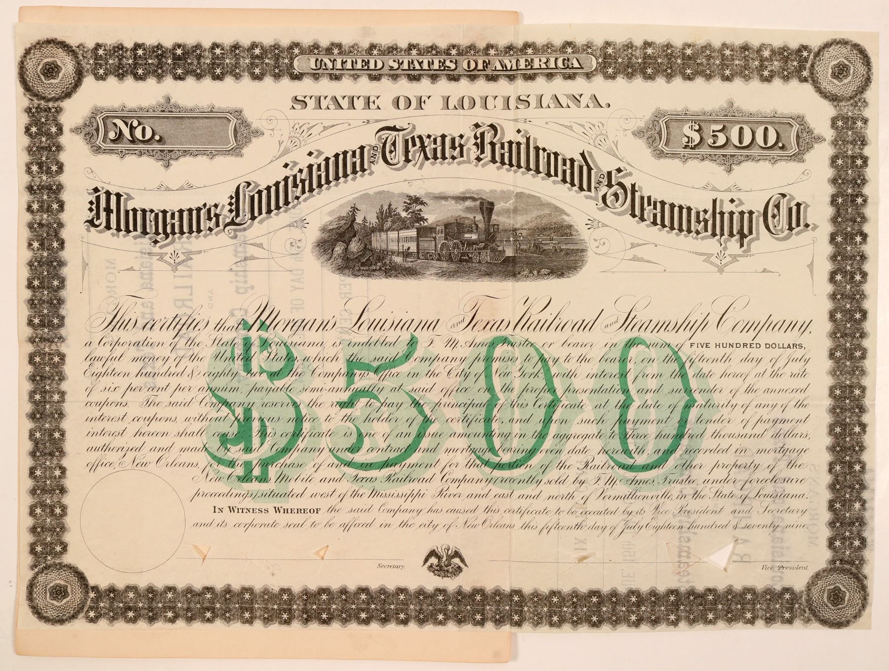 Incorp . 1877 Louisiana. U/C, not numbered, $500, 6%, bearer bond due 1884. Dateline July 15, 1879 (printed). vignette top 4-4-0 w/cars passing l-r river activity, Black, $500 green underprint, printer not identified. Face of bond $500, on reverse is printed $1000, 6% due 1884. India paper proof on card. Cancel punches across bottom. VF