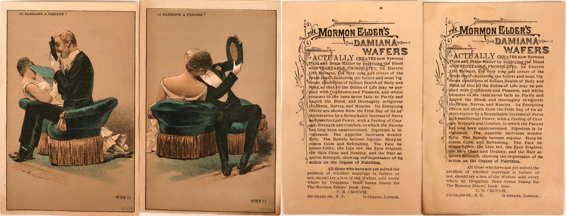 Lot of 2 different for this company based in New York and London, run by FB Crouch. The illustrations are titled "Is Marriage a Failure?" and show a man and woman sitting on opposite facing couch seats for "courting."