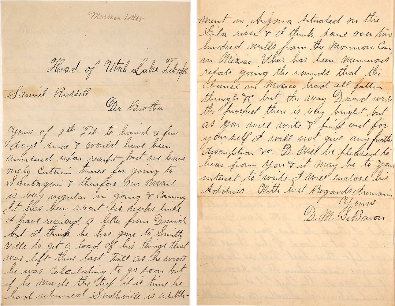 Letter from Samuel Russell to Dr,. Brother regarding coming 200 miles from a Mormon camp in Mexico to Smithville, a settlement on the Gila River in AZ, (Potter Collection) Date: 1886 Location: Utah HWAC# 58954