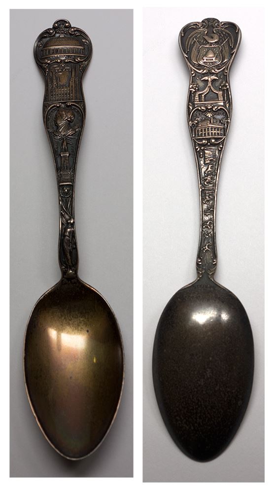Engraved with image of Temple and word 'TEMPLE' at end, bust with'JOSEPH SMITH' below,and monument with 'BRIGHAM YOUNG' below that.