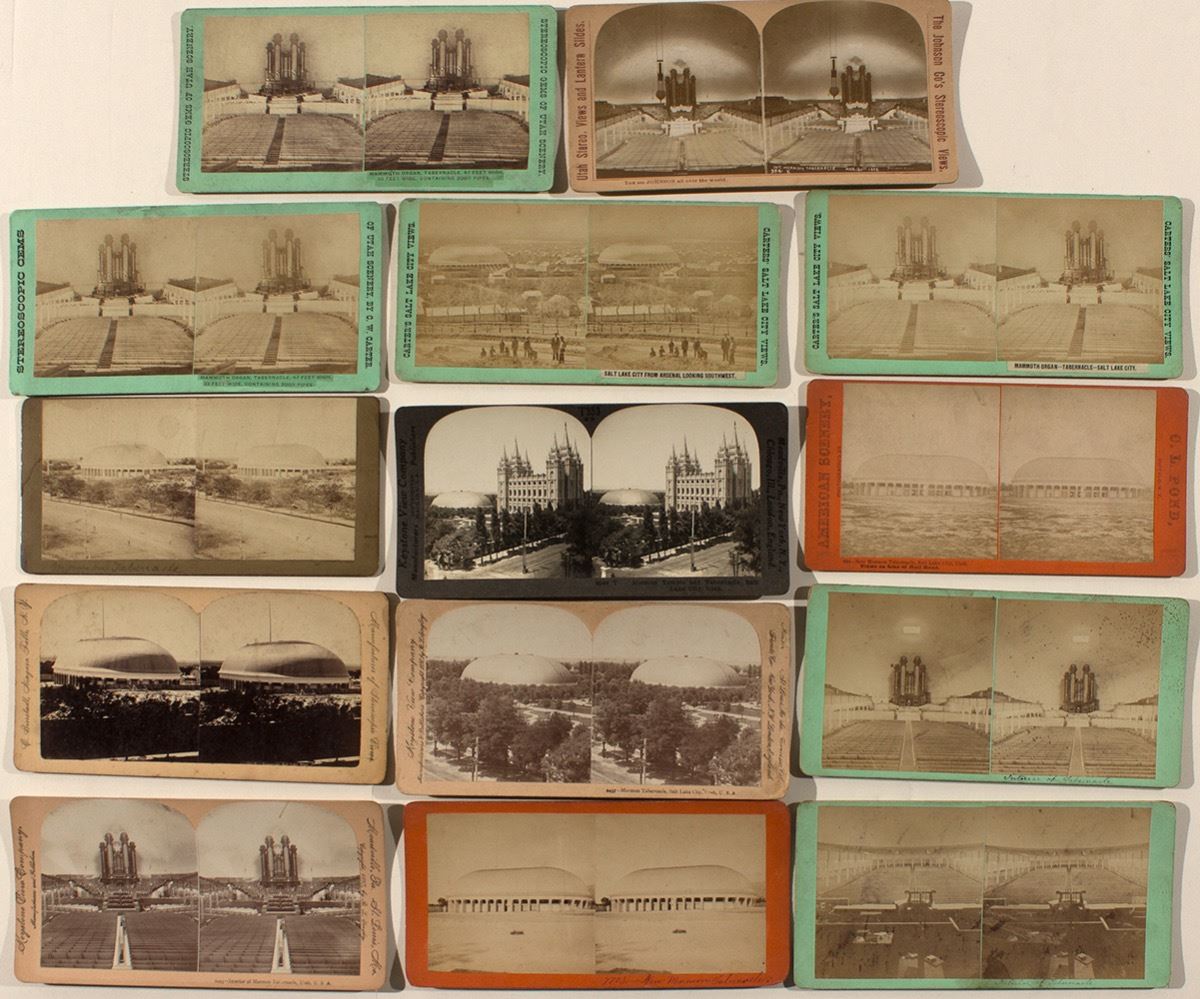 Thirteen stereoviews. 1) Trio of duplicate views of the mammoth organ in the interior of the building. C.W. Carter, photographer, Carter's VIew Emporium. Low to medium contrast. 2) Another Carter stereoview, this time exterior view of city and tabernacle from Arsenal looking southwest. Low contrast. 3) Two different stereoviews of the interior by C.R. Savage: opposing views from the back looking to the front and from the stage looking out. Medium contrast, but soiling. 4) Two different titled "New Mormon Tabernacle." Exterior shots, one identified as being by C.L. Pond. Low to medium contrast. 5) Three different Keystone View Company: two exterior (tabernacle and tabernacle plus church) and one interior (6023). Medium contrast. 6) Two additional exterior views: Bierstadt and the other by A.J. Russell, Union Pacific. Low to medium contrast, some soiling. 7) A Johnson Co. stereoview of the interior dated March 21st, 1898. Medium contrast. Please inspect! (Prag Collection) City: Salt Lake City State: Utah Date: hwac# 27143