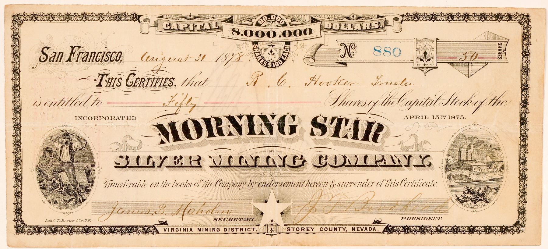 Virginia Mining District, Storey County, Nevada (printed along the bottom). Inc. April 1875. No. 880, issued for 50 shares to R.C. Hooker, trustee, on AUg. 31st, 1878. Signed by J.F. Broadhead as president and James B. Maholm as secretary. Not cancelled. Attractive design with black border and print, two mining vignettes (on opposite sides), and a white star at the bottom. Lith. by G.T. Brown & Co., SF (noted African-American lithographer). Pinholes, folds, creases. 4.25 x 9.25" Not in Filer. One of the earliest claims on Cedar Hill, dating to 1860. On the Red Ledge, with the Sierra Nevada Mine to the north and east, and the Utah on the south. A tunnel was sunk early on to 600 ft., intersecting the ledge at a depth of 200 ft, but the mine encountered multiple problems with water. The ore was very high in gold (65%). The company is now resuming operations after being idle for a long time. [Ref: Pacific coast annual mining review and stock ledger, 1878, pg. 263] () Ken Prag Collection