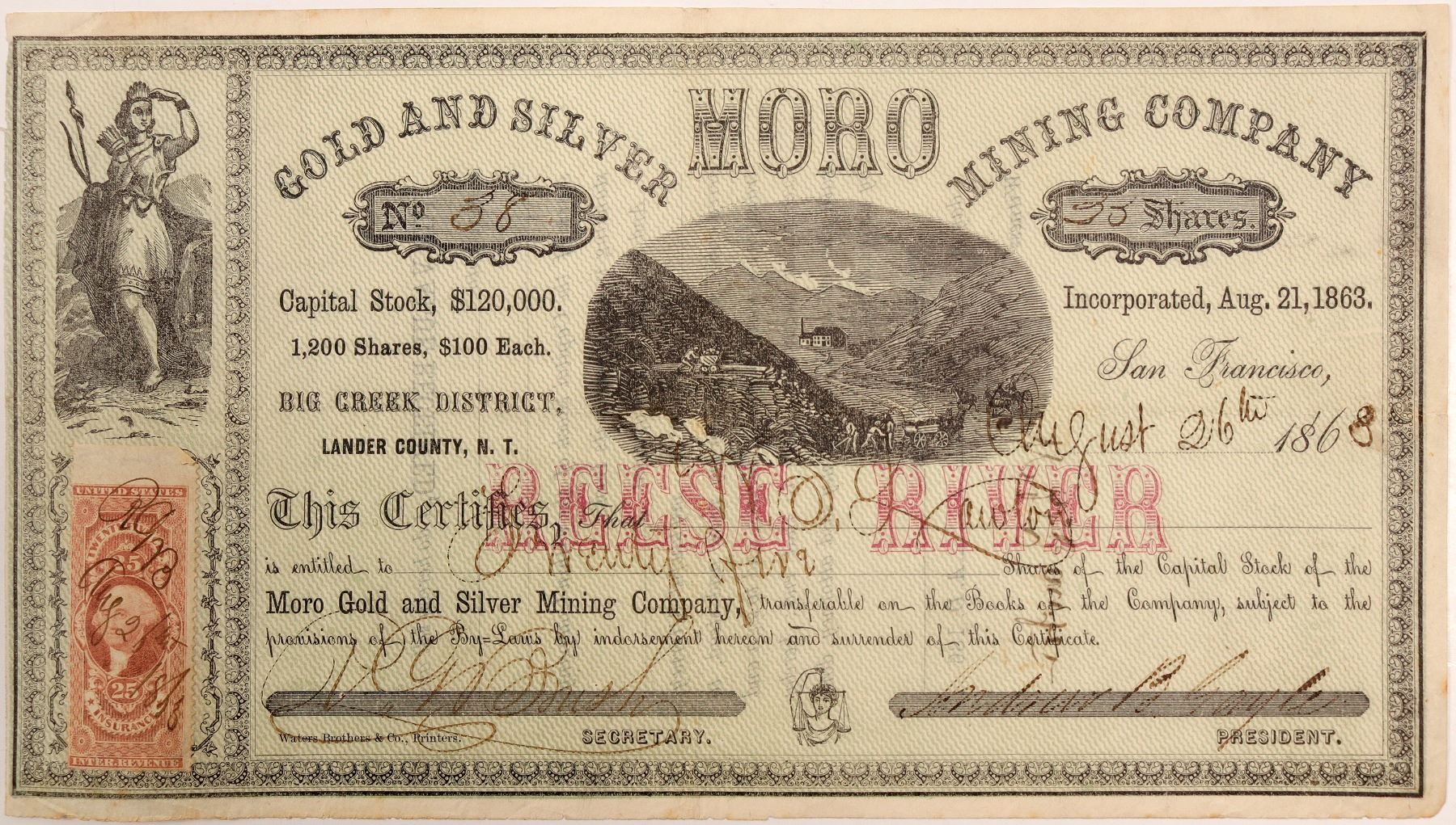 # 38 for 25 shares to Lawlor. Signed by RG Brush and president Gayle. Names are difficult to read on safety paper. Dateline August 26, 1863. Incorporated August 21, 1863. 25c Insurance revenue stamp. Not cancelled. Female Native American vignette left. Mine to mill vignette center. Water Brothers printer. Red underprint 'Reese River.' Green safety paper. Rounded corner, nicks on border. Very nice. One assessment levied in 1864. Ken Prag Collection