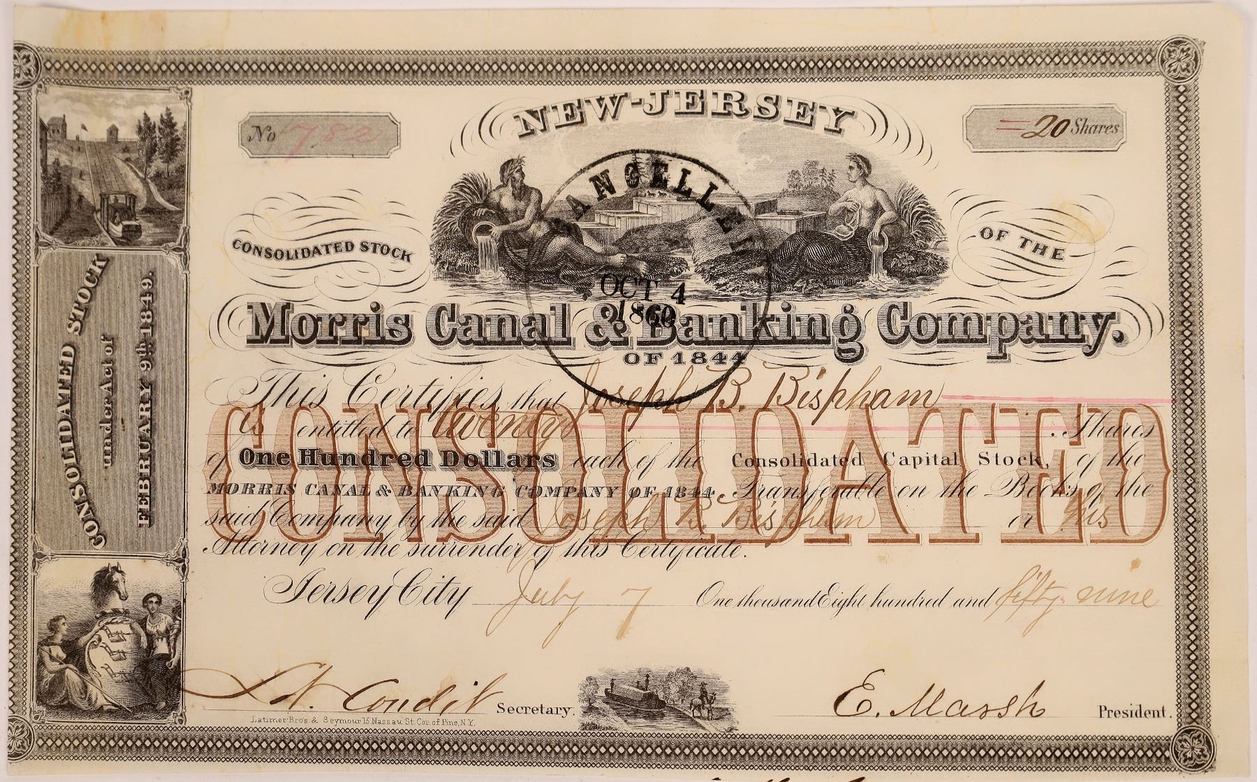 # 782 for 20 shares signed by president E. Marsh and secretary. Issued to Joseph Bispham in 1859. Unusual round stamp cancel Ò Oct. 4, 1860. Allegorical vignettes with one funicular type road! Seeking to improve transportation between the coal mines of Pennsylvania, the iron forges of Morris County, and the great marketplace of New York City, the state legislature chartered the "Morris Canal and Banking Company" in 1824 to build an artificial waterway between the Hudson and Delaware rivers. When completed in 1837, the canal measured 109 miles in length and over 1,000 feet in elevation, and contained 23 inclined planes and 34 locks. State:Pennsylvania City: Date:1844 Provenance: