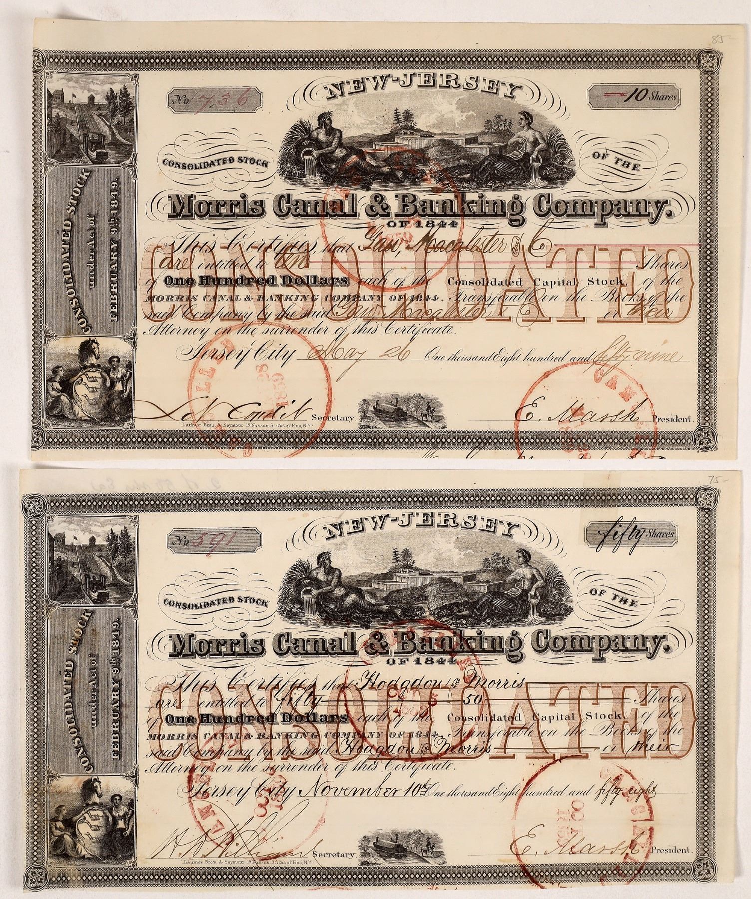 Lot of 2 issued stocks, 1858 and 1859. (Not tied to Robert Morris). Signed by the president (E. Marsh) and secretary William and Condit. Stamp cancelled. Four vignettes with allegorical and canal themes. 5.75 x 9.5" The Morris Canal & Banking Co. operated the Morris Canal, used for transportation of anthracite coal from Pennsylvania's Lehigh Valley to northern New Jersey's growing iron industry and other developing industries in New Jersey and the New York City area. The canal also carried iron ore to iron furnaces in western New Jersey and eastern Pennsylvania until the development of Great Lakes iron ore caused them to decline. It remained in heavy use throughout the 1860s. In 1871, it was leased to the Lehigh Valley Railroad and taken over by the state of New Jersey late in 1922.