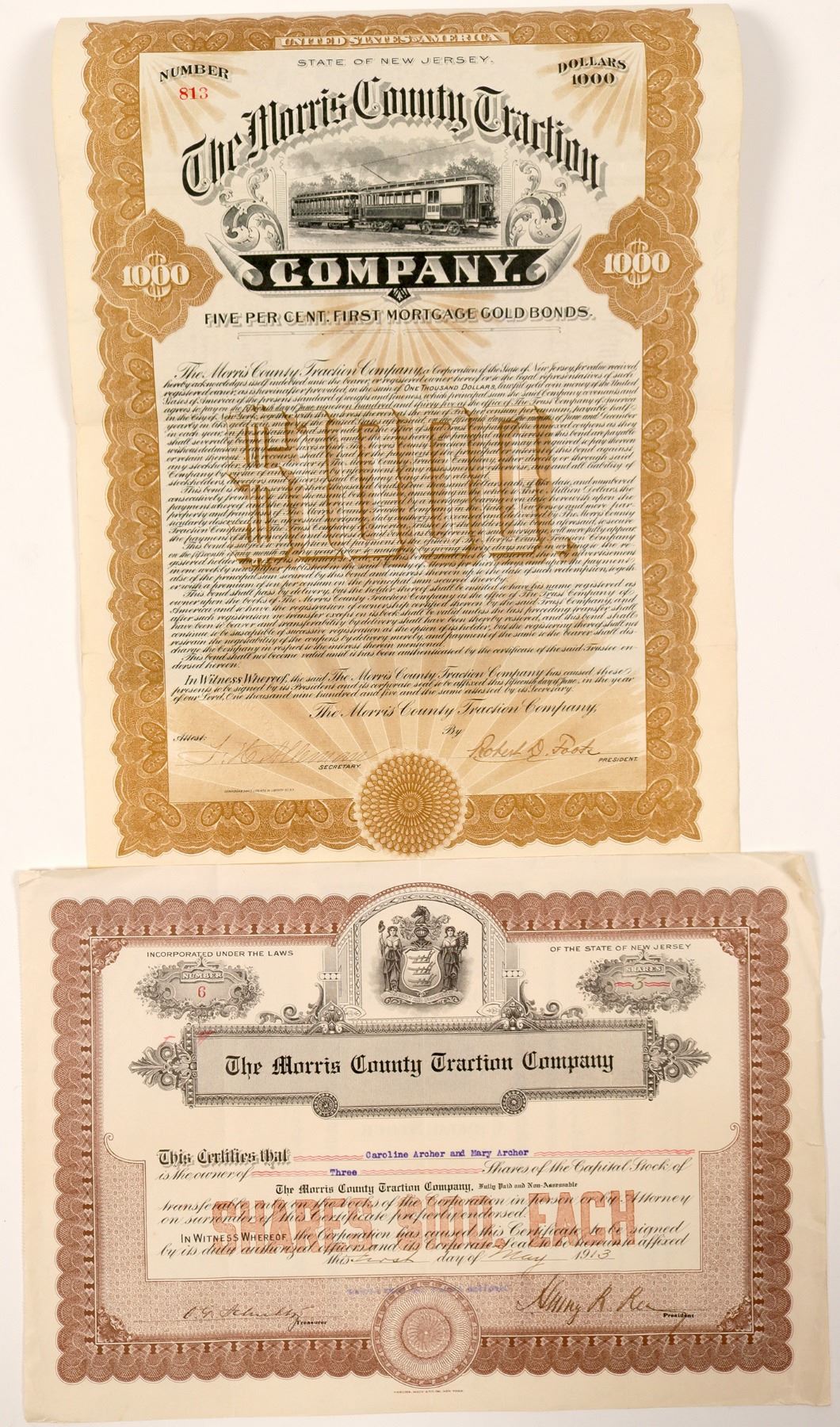 #813, I/U, $1000 5%, 30 yr due 1935 bearer bond issued June 15, 1905, signed Robert D. Foote President, GOLD, embossed seal, vignette electric street cars l-r under wavy title, "$1000" and sunburst in gold underprint, coupons attached (34 missing), Dennison & Sons Litho printers. VF