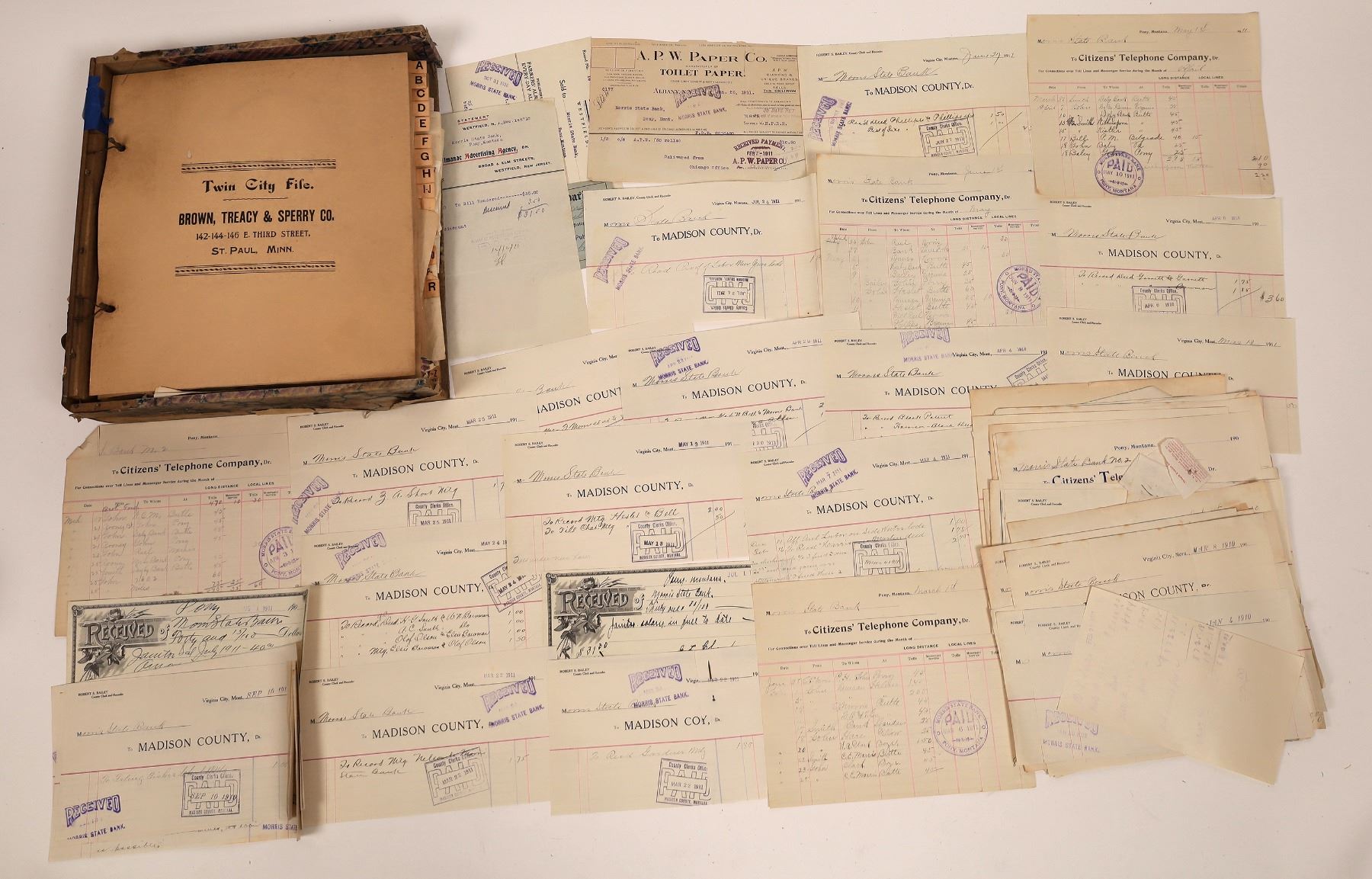 A complete alphabetic file of original business correspondence to Morris State Bank between 1910-1912. Includes correspondence between vendors, advertisers, account holders, the State Treasurers Office, Federal regulatory offices, printers, utility companies, investors, escrow companies, supply companies, government offices, general merchandisers, freight companies, publishers, surety companies, railroads and too many others to name. Subject matter covers every facet of daily business operations and services provided by the bank. Correspondence to account holder returned to the bank and unopened, escrow agreements, invoices, receipts, tax statements, records of deposit, payment vouchers, account statements, service agreements, interest payments, account settlements, supply orders, et.al. Includes some highly sensitive, confidential financial correspondence. 200 or more pieces, dozens of collectible letterheads.