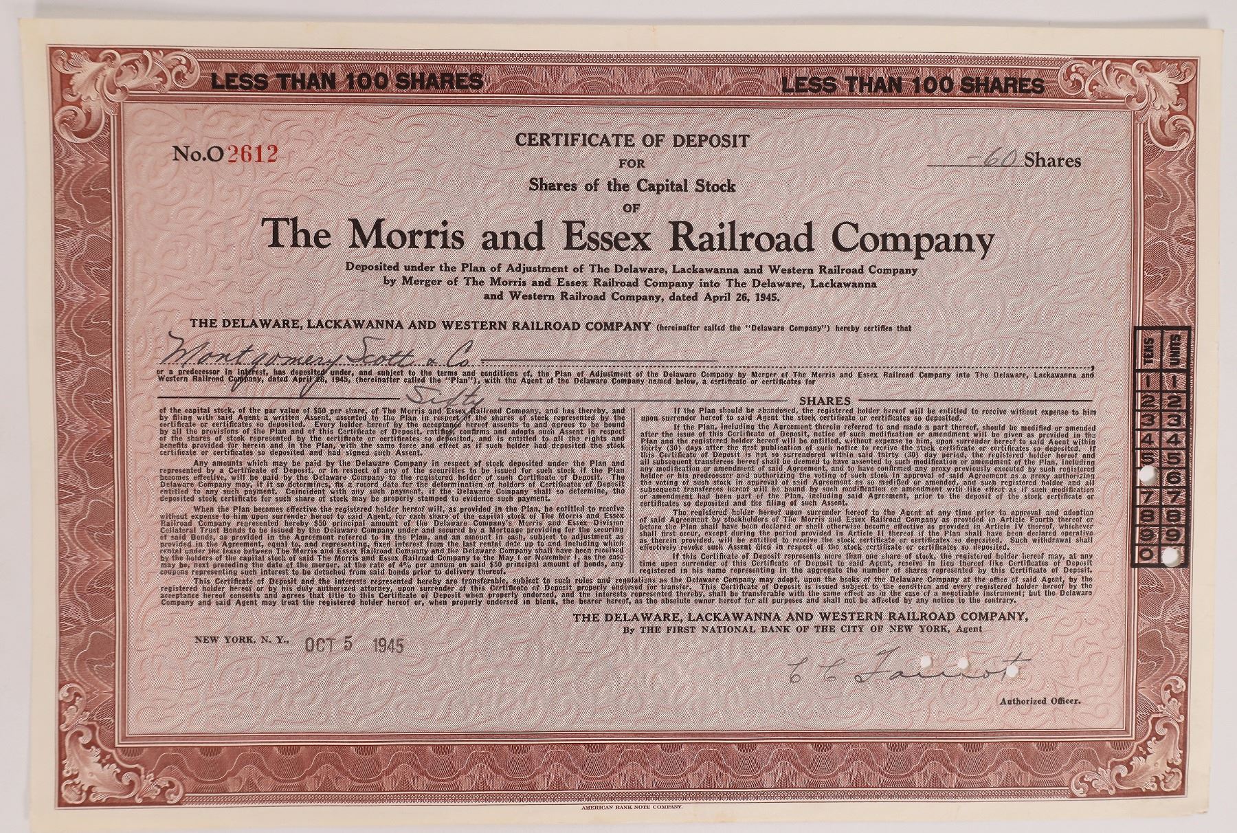 Morris and Essex Railroad Co, Stock, incorporated NY, No. O2612, 60 shares issued to Montgomery Scott & Co, 1945, signed by authorized officer (illegible), 12x8", I/c, 1 cert