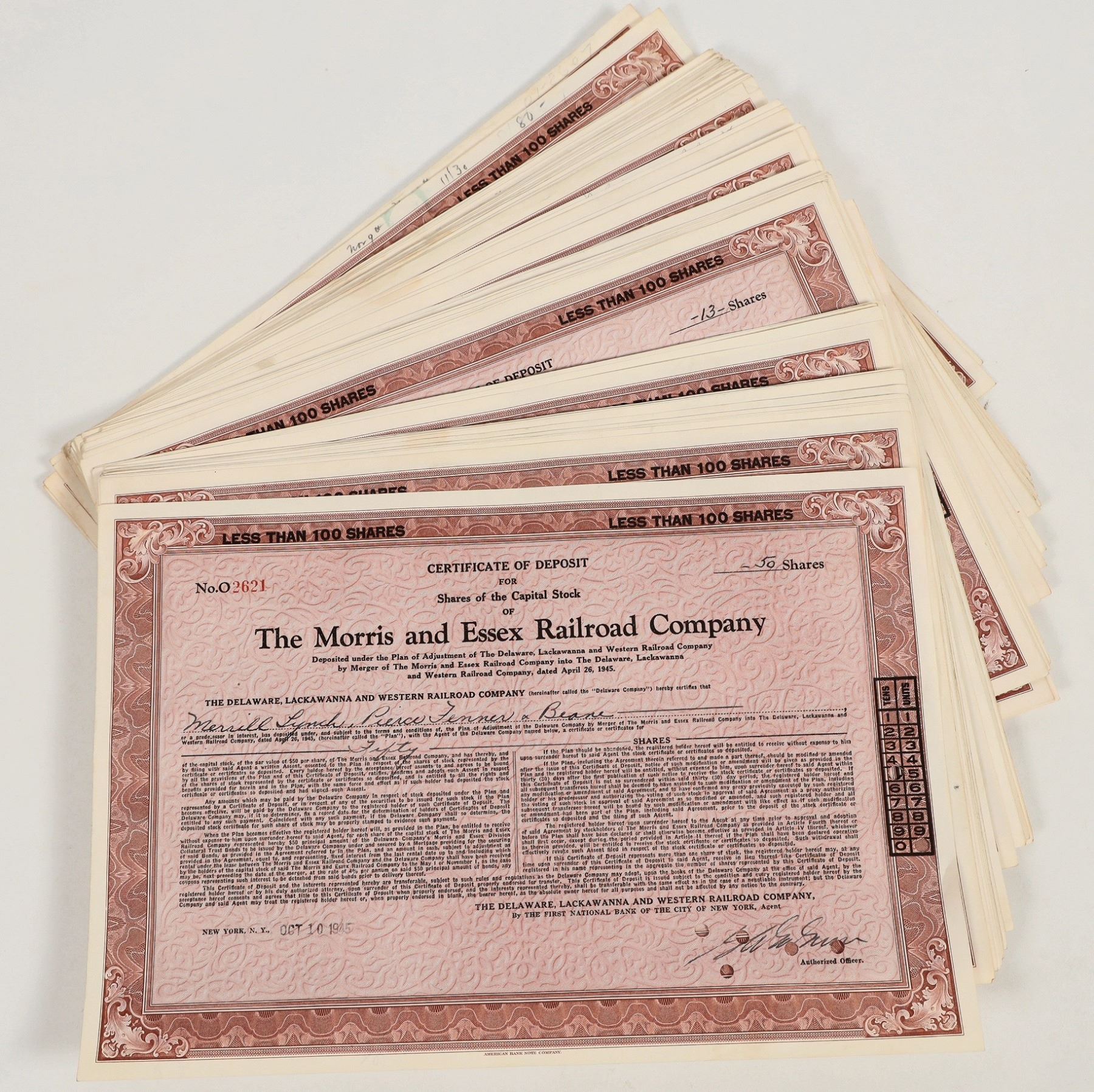 There are over 90 stock certificates for the Morris and Essex Railroad Co. of New Jersey. The date of issue is 1945 after their merger with the Delaware, Lackawanna, and Western Railroad Co. (DL&W) line. Please see photo for details.