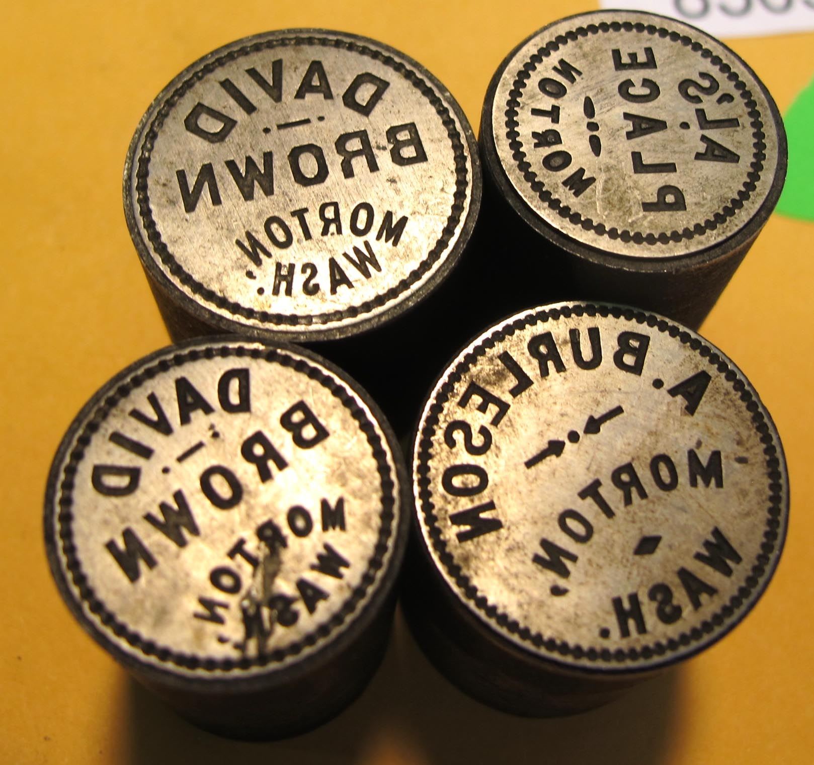 4 token dies self identified from Morton, WA. 21mm: Al's Place, David Brown. 24mm: David Brown, A Burleson. Northwest Territorial Mint Historical Token Die Collection