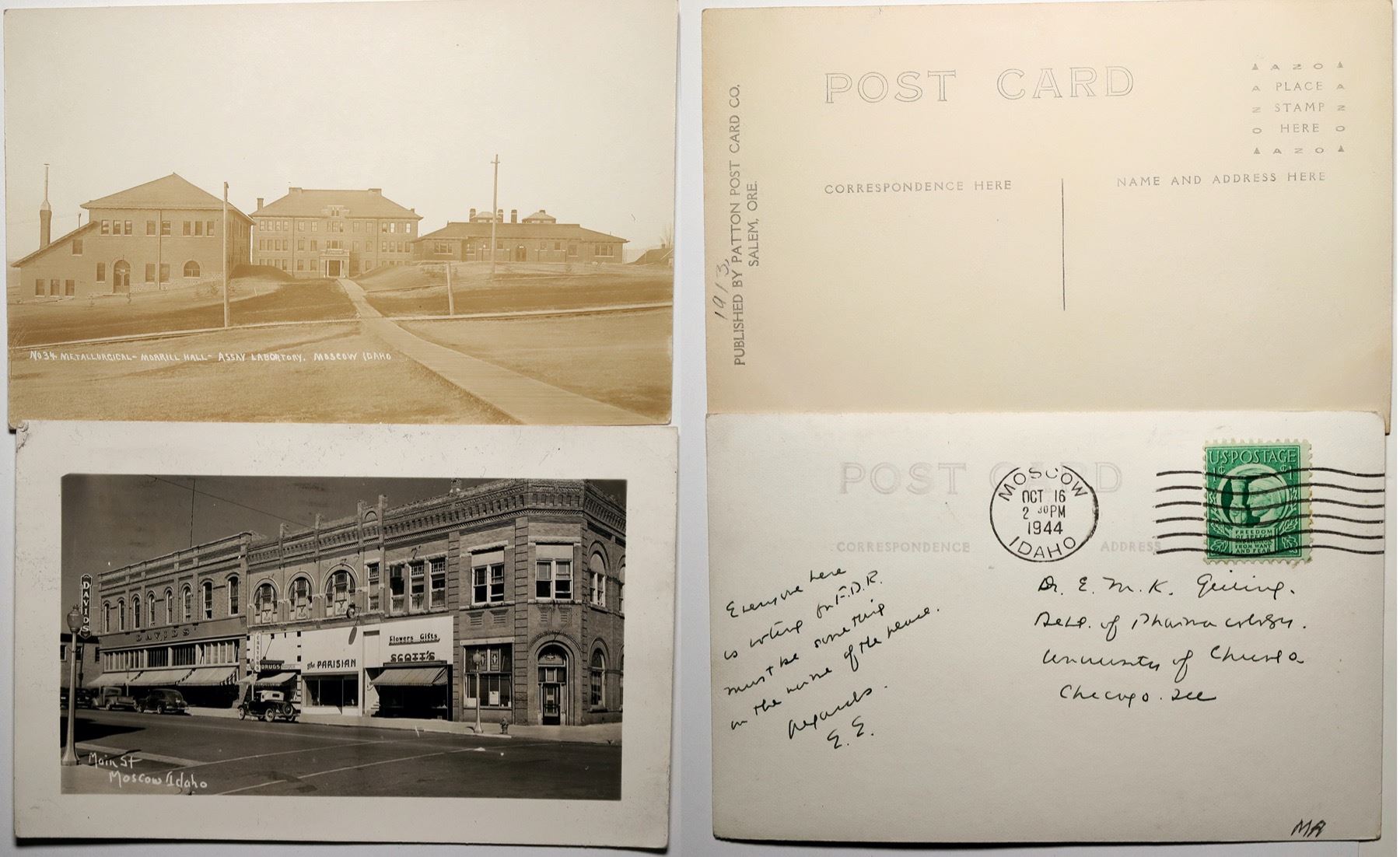 Main St., Moscow Idaho, street front business district, black/white image with borders, rectangular photo postcard smaller than most, cancelled mark, Oct. 16, 1944 , Scott's Flowers, Gifts, the Parisian , David's corner store, correspondence refers to President FDR ( Franklin Delaware Roosevelt);Cancelled green one cent US Postage stamp "Freedom of Speech and Religion, From Want and Fear"