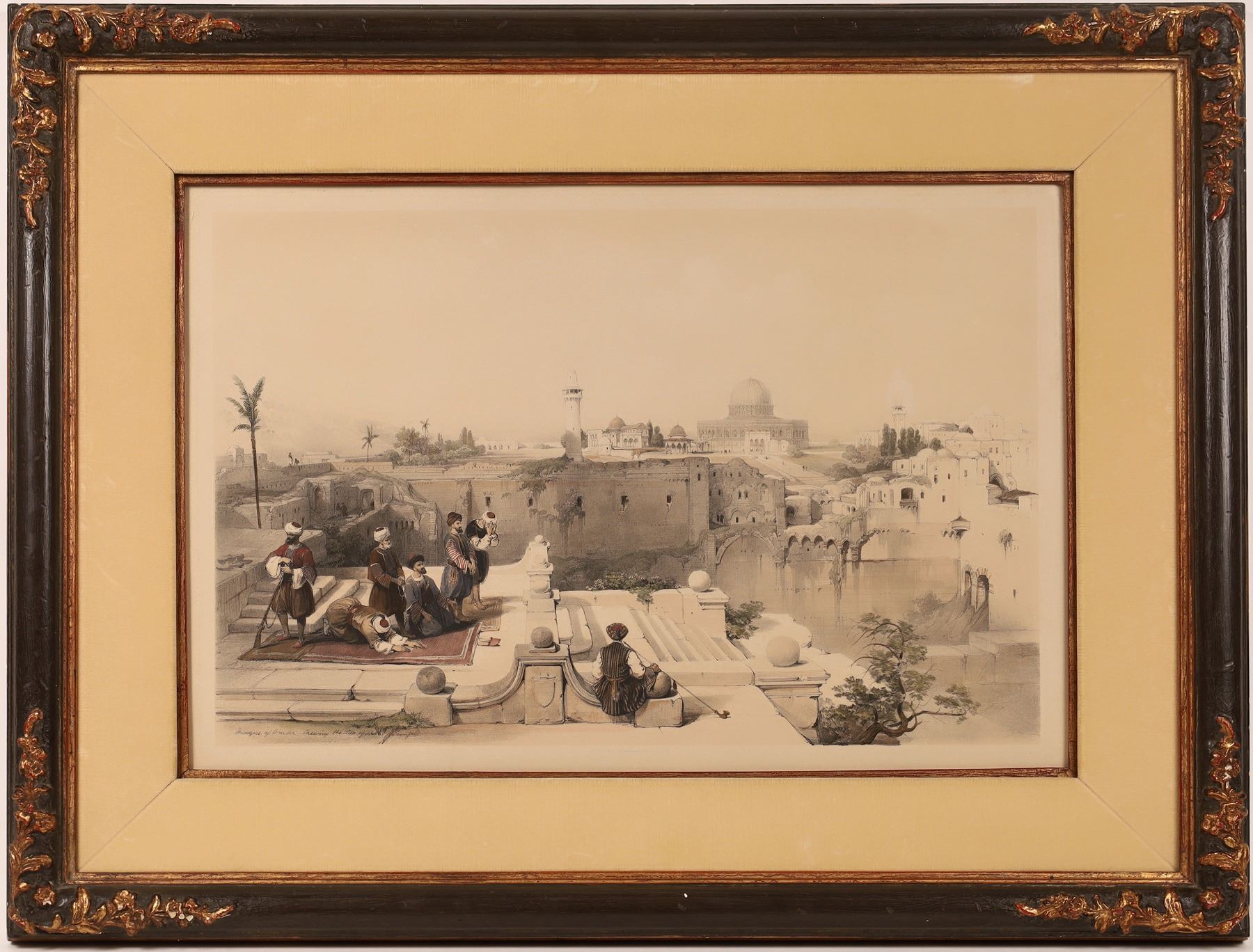 Mosque of Amar, Showing the Lite of the Temple. The antique Lithograph is after the painting by David Roberts R.A. (1796-1864, born in Stockbridge, near Edinburgh) and was created by Belgian engraver Louis Hague (1806-1885) and published by F. G. Moon in London between 1842 and 1849. Framed and matted, 23" x 29", lithograph, 15.5 x 22".