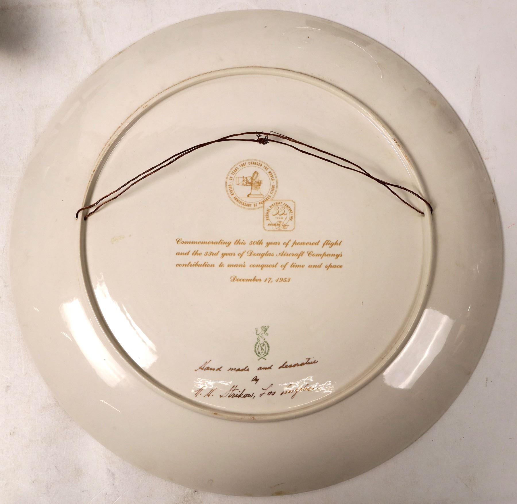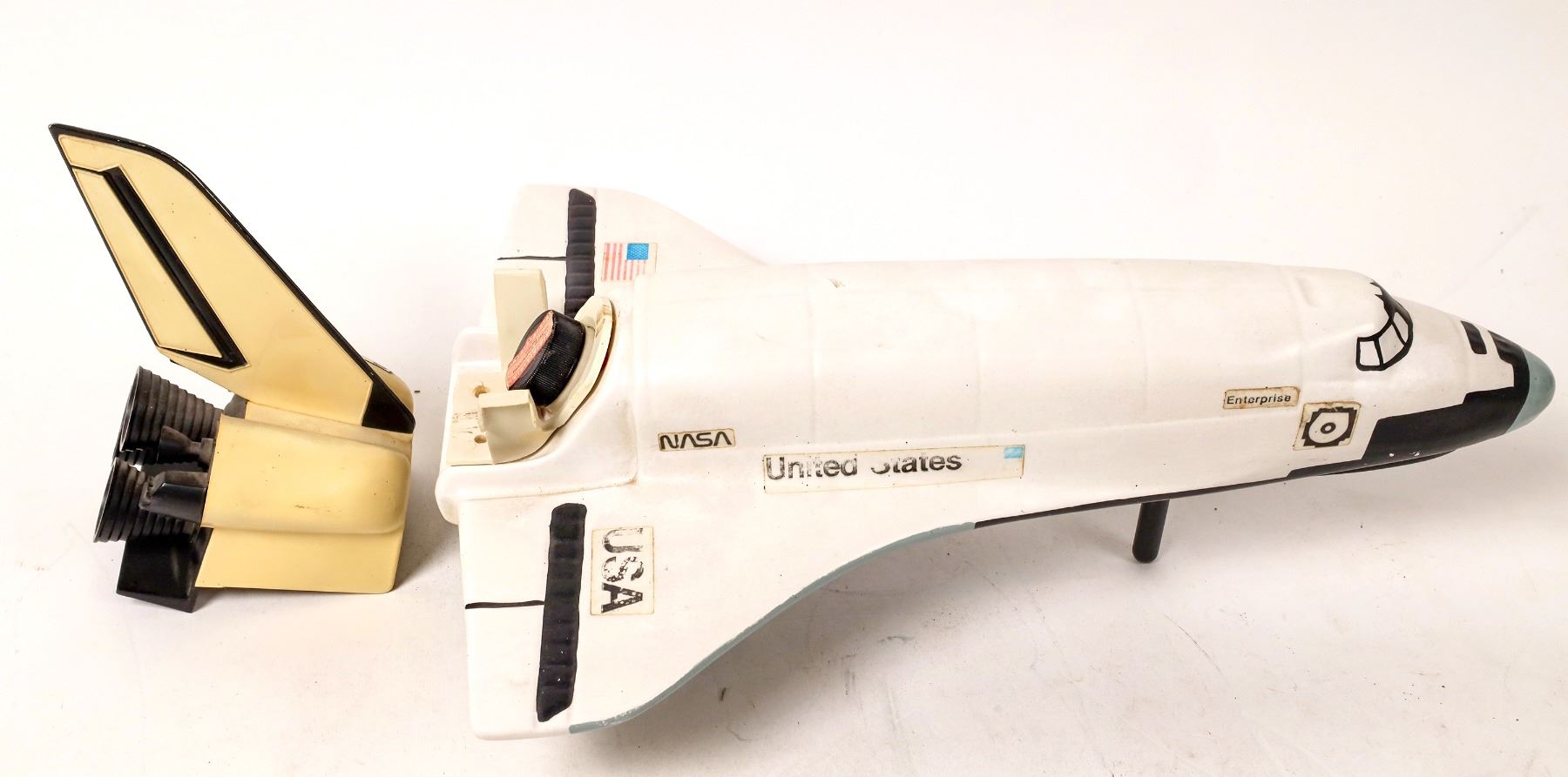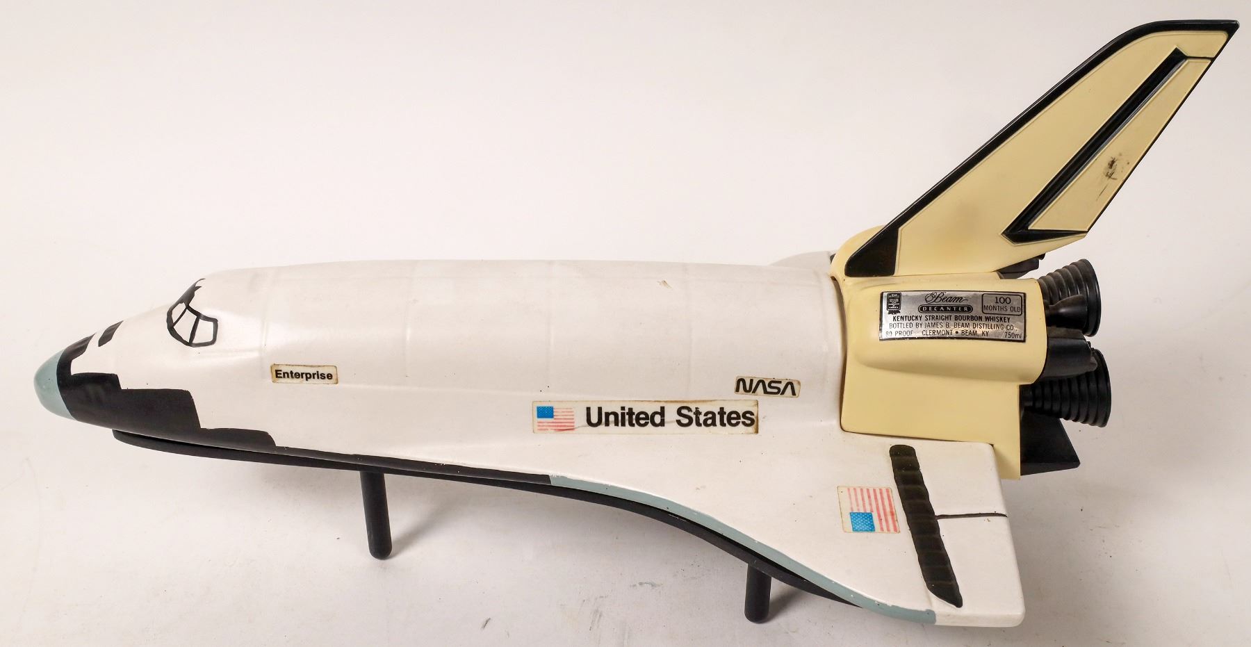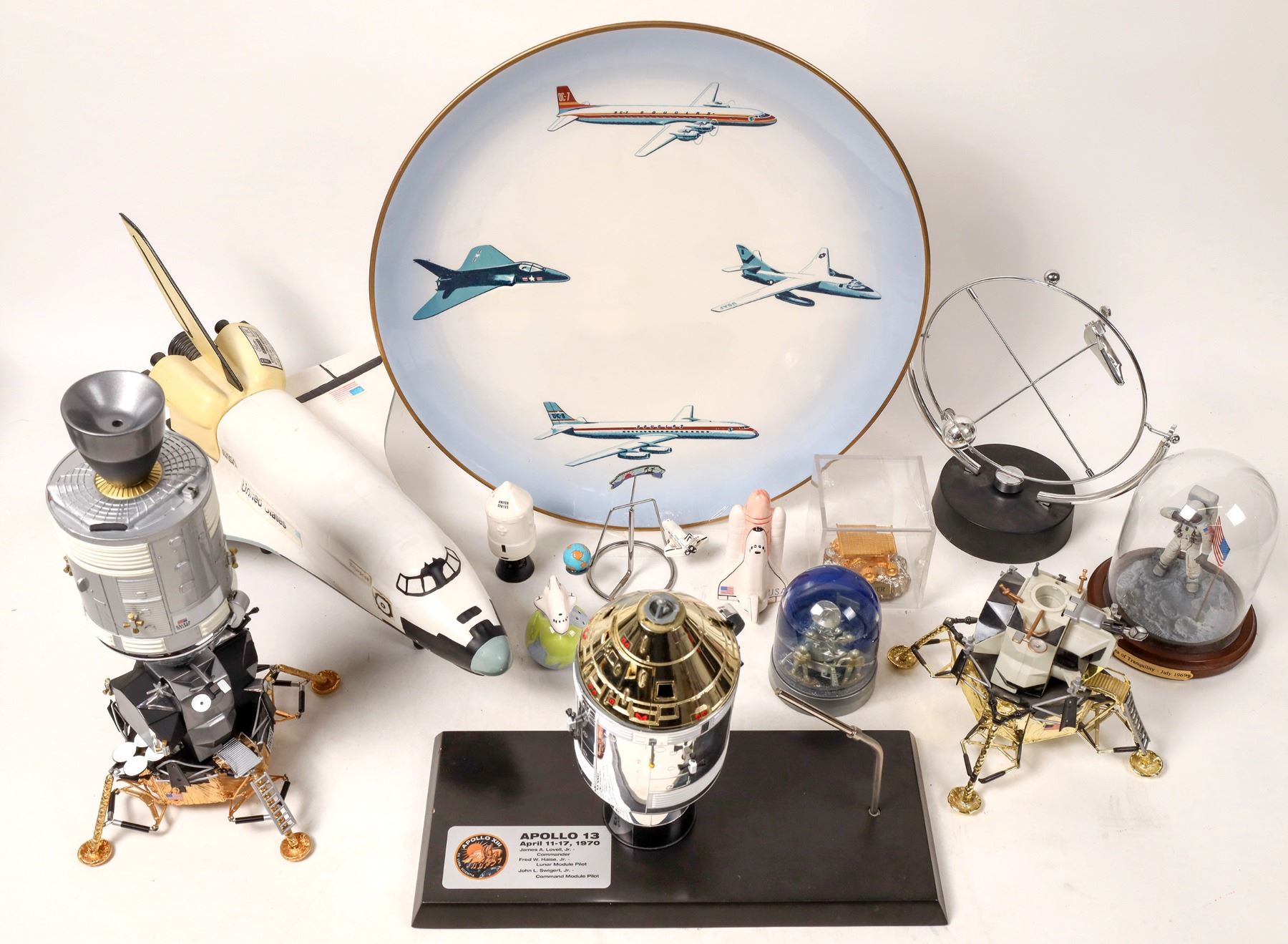 1 plastic and 1 metal command/service module about 9". 1 plastic and 1 metal LEM about 5" tall. 4" lunar snow globe. 16" long empty Jim Beam Enterprise decanter and a few smaller items. 15.5" 1953 Douglas aircraft plate.