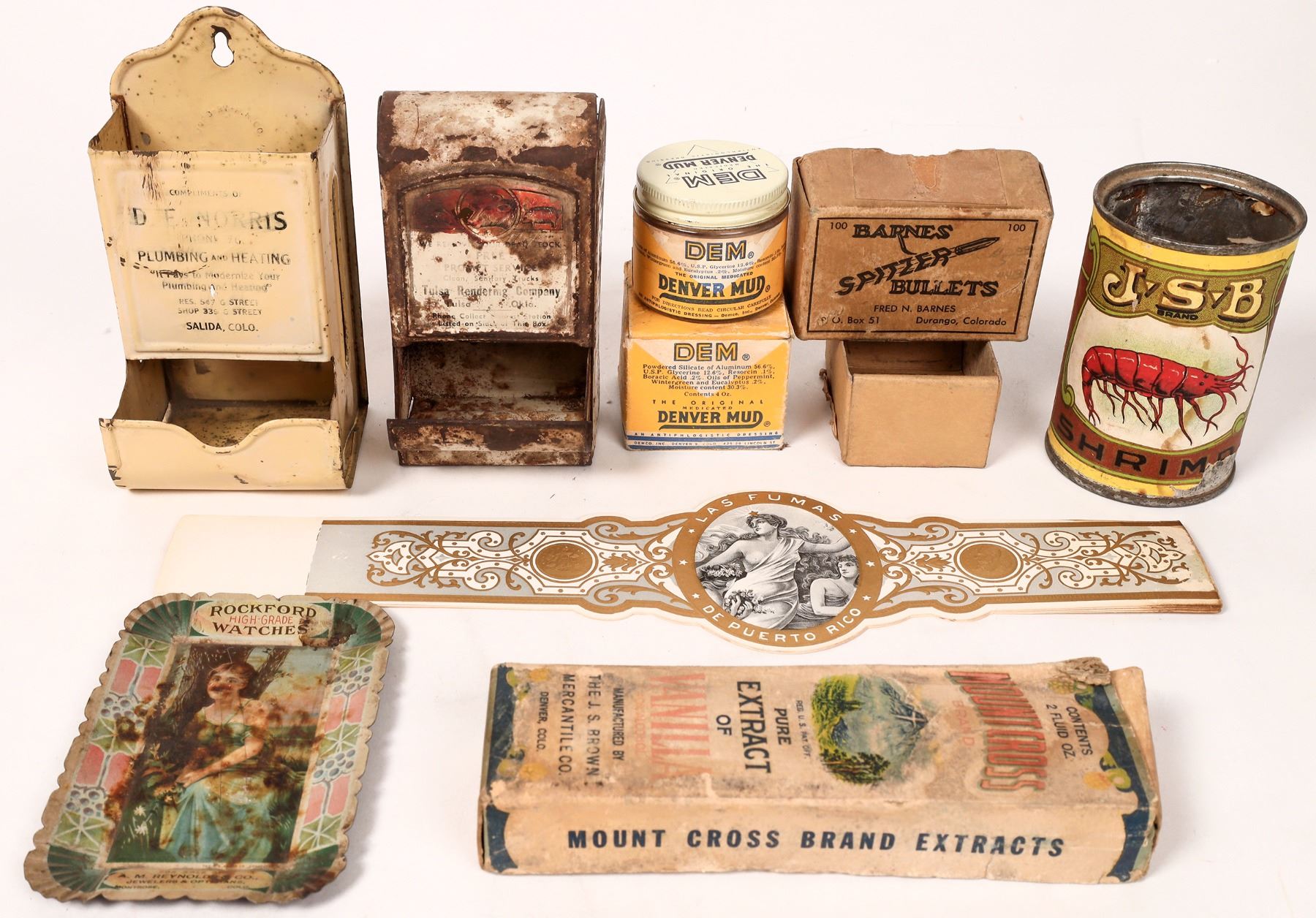 JSB Denver can, about 8 large cigar bands, Vanilla box Denver. Rockford Watch metal ashtray 5x3.5". Denver Mud in original box-missing 1 flap. Barnes Bullets empty small box. Small metal dispensers-D E Norris Plumbing, Salida. Tulsa Rendering, Tulsa. Colorado Gary Bracken Collection