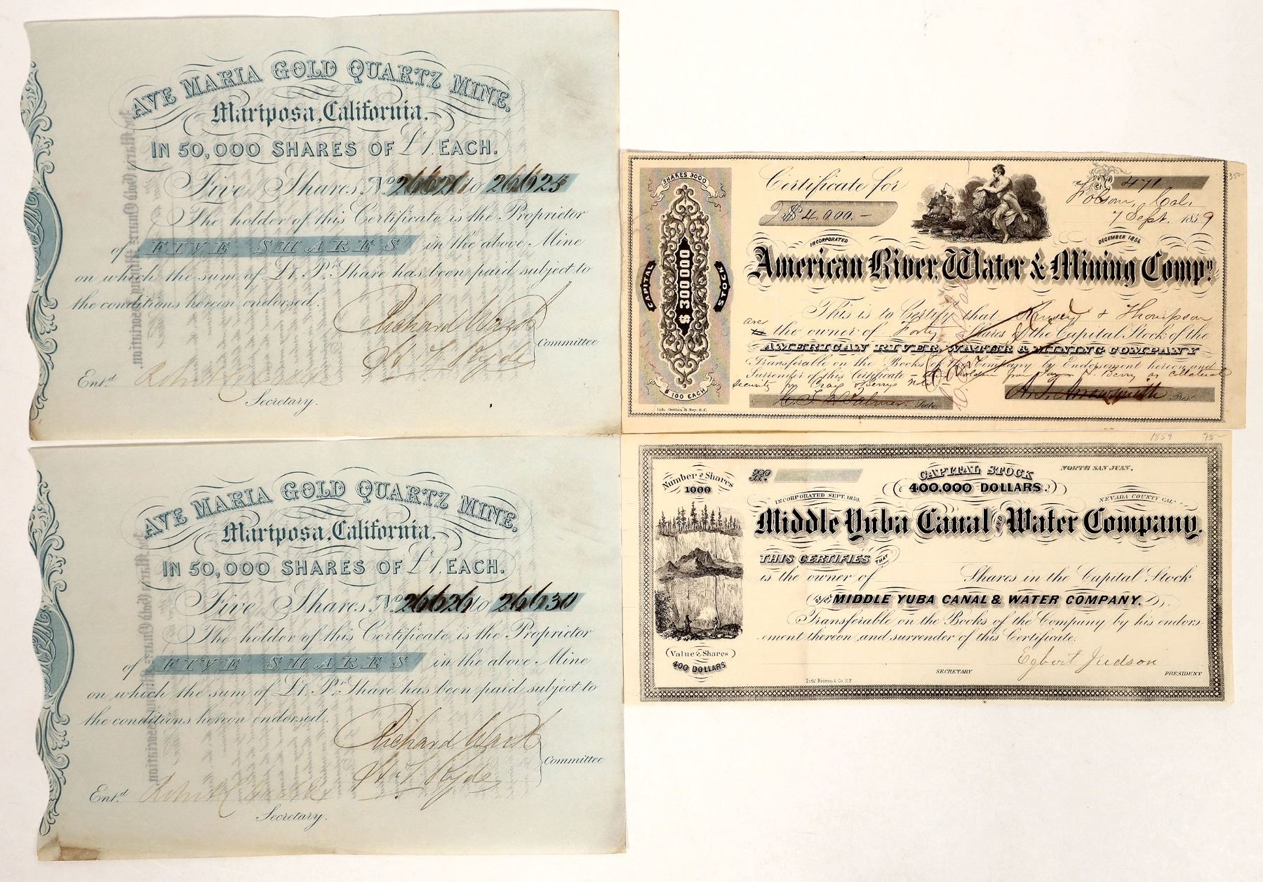 Two Issued-1851 Ave Maria Gold Quartz mining.The Ave Maria's place is verified by a letter written from John Duncan to John Fremont on December 26, 1851. In the letter he clearly states that the Ave Maria is located on the Mariposa Estate and on the Ave Maria River. [Ref: The Expeditions of John Charles Fremont, Volume 3, edited by Spence]. Today the Ave Maria River is known as the Stockton Creek [Ref: Gudde]. There was a small town by that name at the confluence of the Ave Maria and Mariposa.