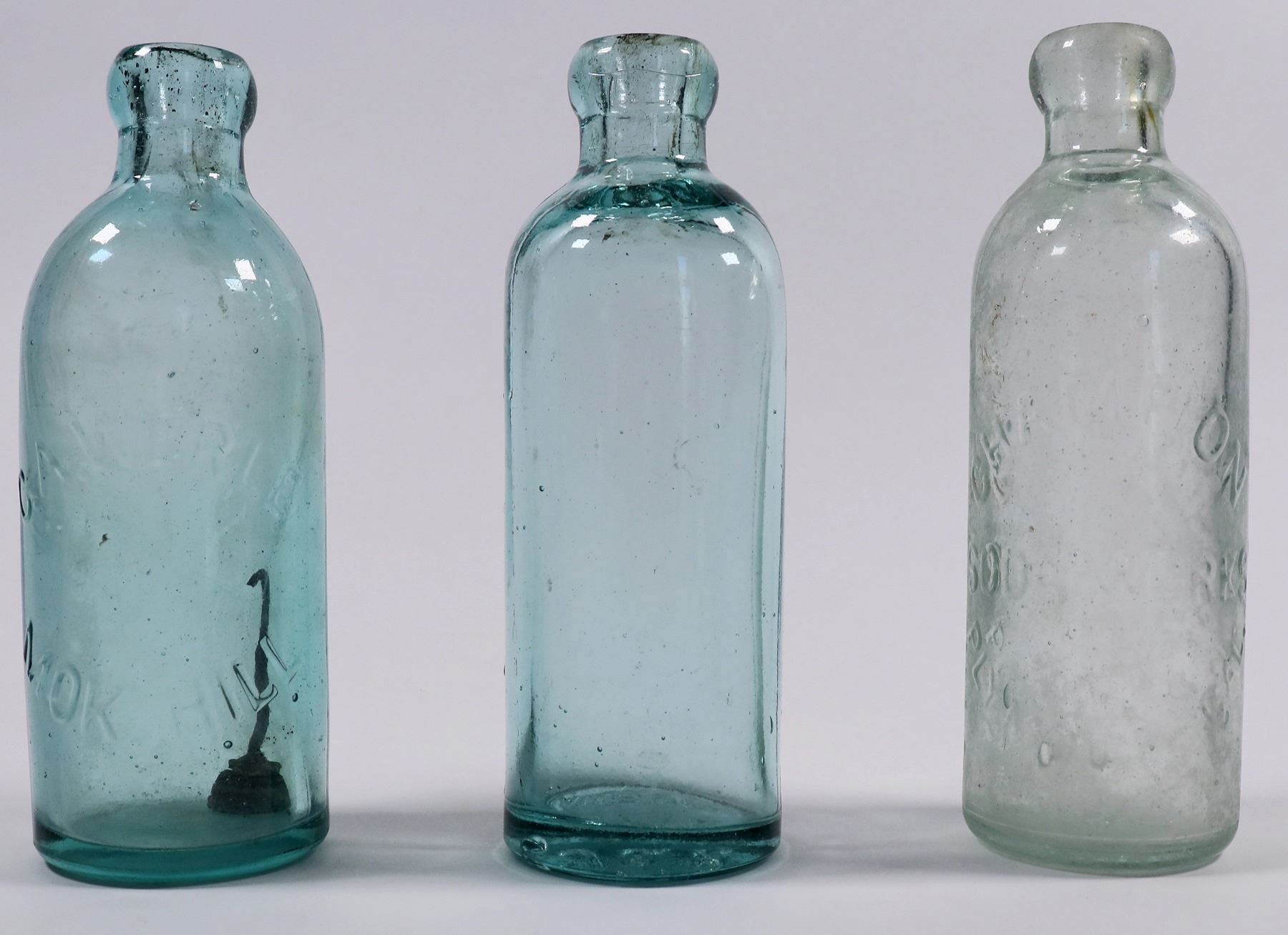 3 Mother Lode Hutch soda bottles, all about 6.5:. Aqua C A Werle/Mok. Hill. Aqua J & R/Auburn. Off clear Champion/Soda Works/Plymouth, Cal. stained. No apparent chips or cracks. Mother Lode California