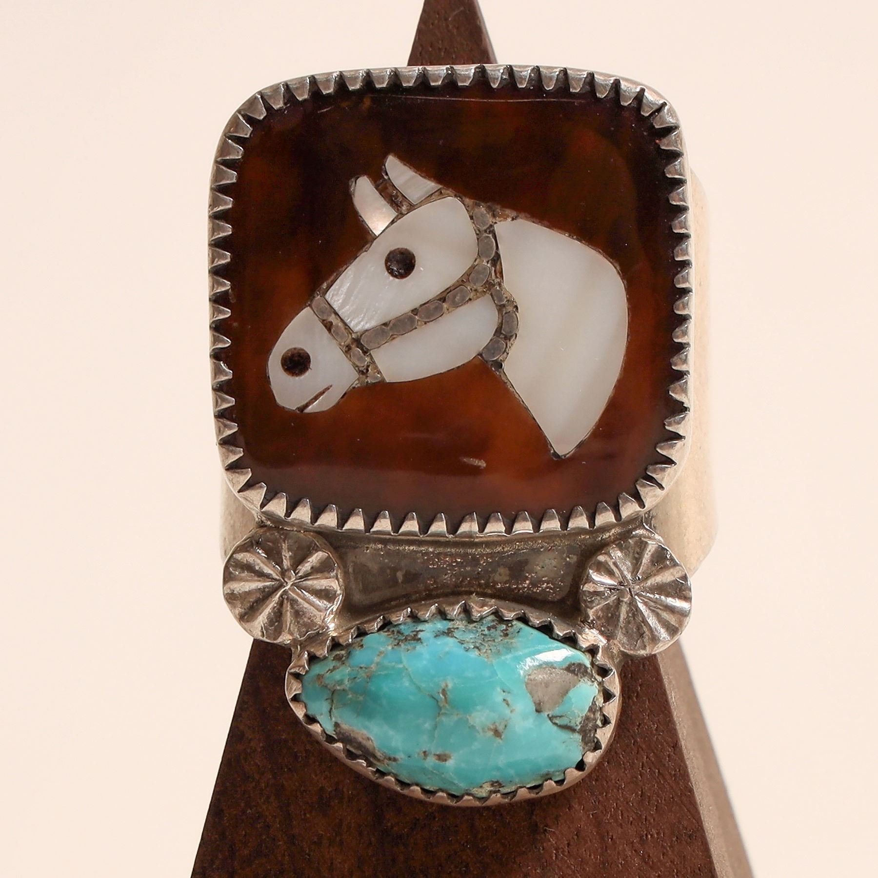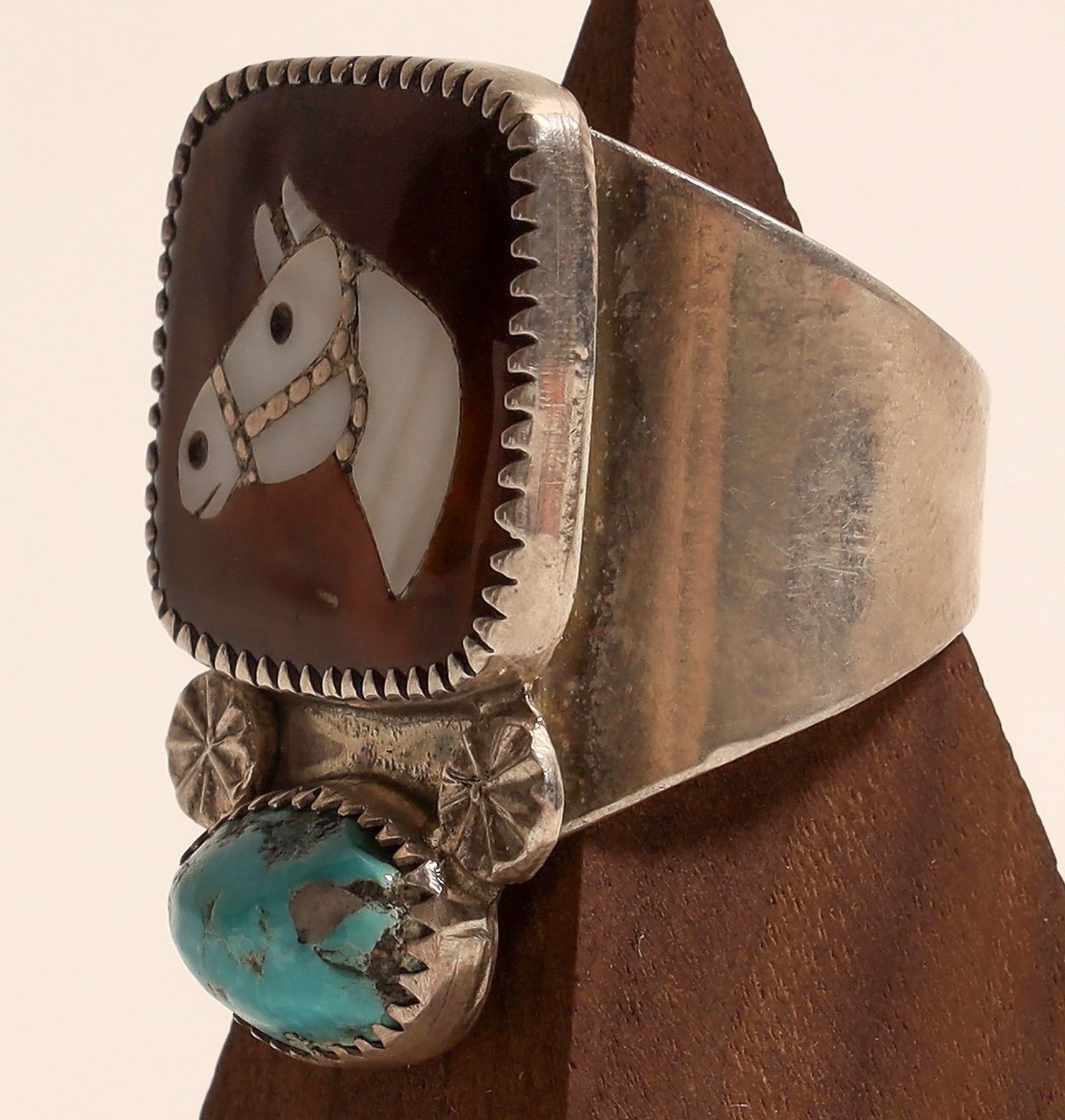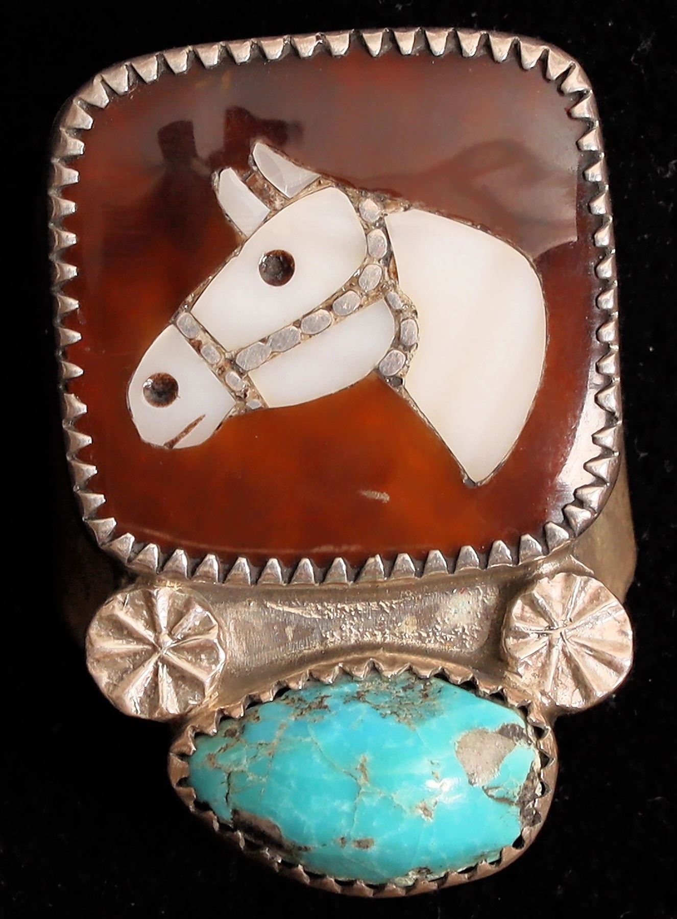 Beautiful inlaid horse with turquoise and Mother of Pearl silver ring. Unsigned. This ring is probably the work of Isabelle Simplicio. The design of the horse head with turtle shell inlay is very distinctive (and unique!). Her work is also generally not signed. (See Hall, Zuni..., vol. 1, p60) Plus, a large desert Big Horn Ram hand carved Mother of Pearl. Our collector, Mr. Lewton strongly valued this piece paying a significant amount of money for it. Frank Lewton Collection, 1970's.