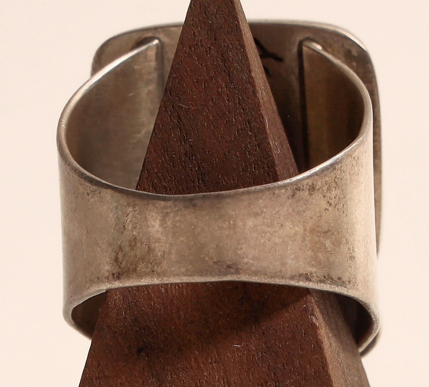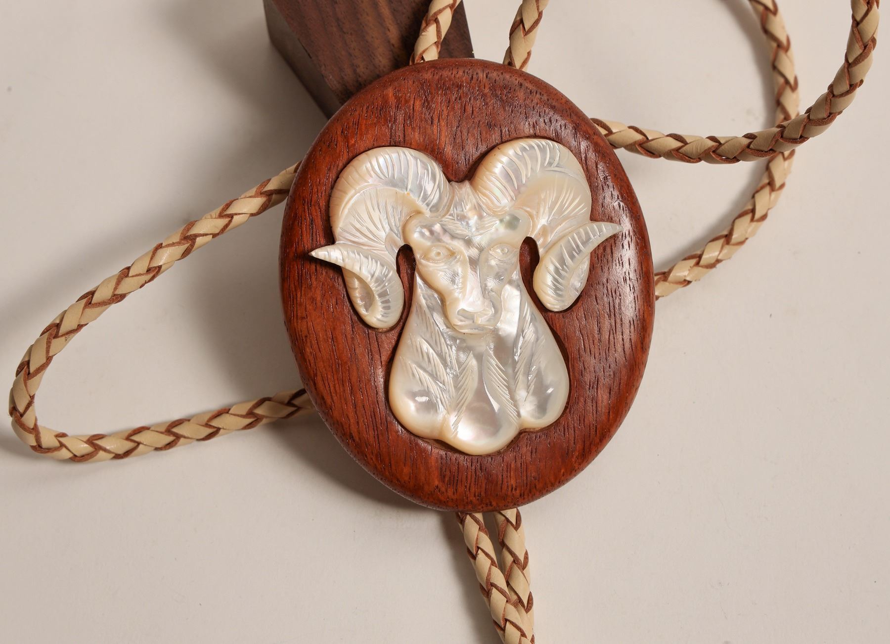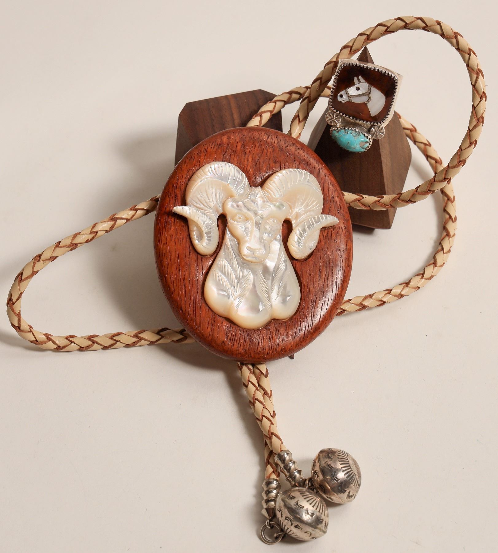 Beautiful inlaid horse with turquoise and Mother of Pearl silver ring. Unsigned. This ring is probably the work of Isabelle Simplicio. The design of the horse head with turtle shell inlay is very distinctive (and unique!). Her work is also generally not signed. (See Hall, Zuni..., vol. 1, p60) Plus, a large desert Big Horn Ram hand carved Mother of Pearl. Our collector, Mr. Lewton strongly valued this piece paying a significant amount of money for it. Frank Lewton Collection, 1970's.