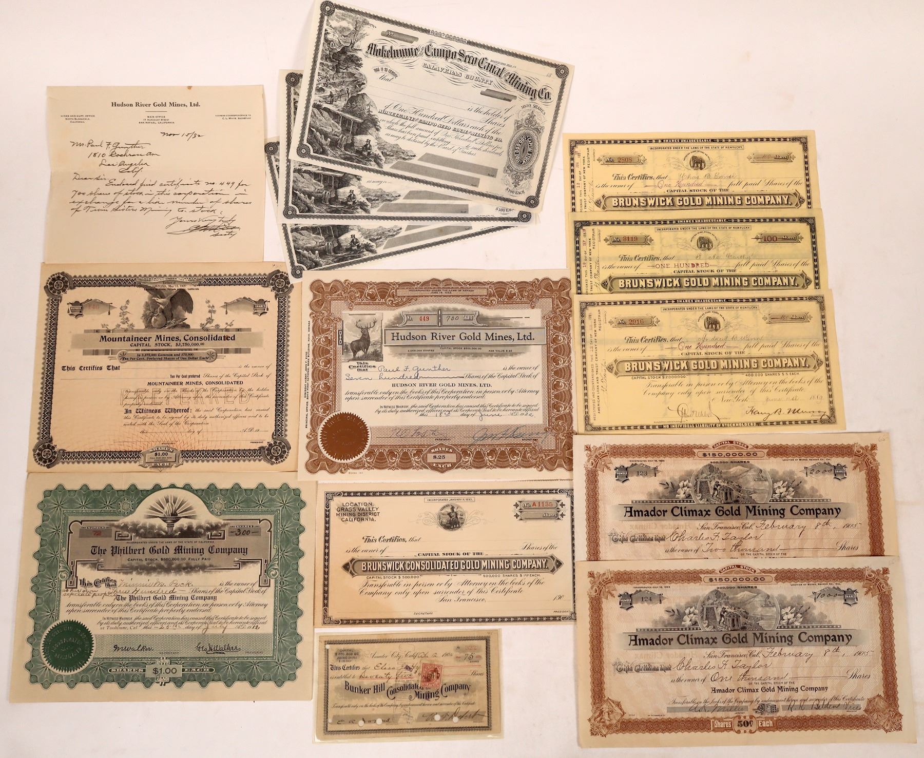 13 California Motherlode gold mining stocks. c. 1889-1932. Brunswick Con., 3x u/i Mokelumne And Campo Seco, Philbert, Amador Climax x2, 3x Brunswick, Bunker Hill Con, Mountaineer, Hudson River. California Ken Prag Collection