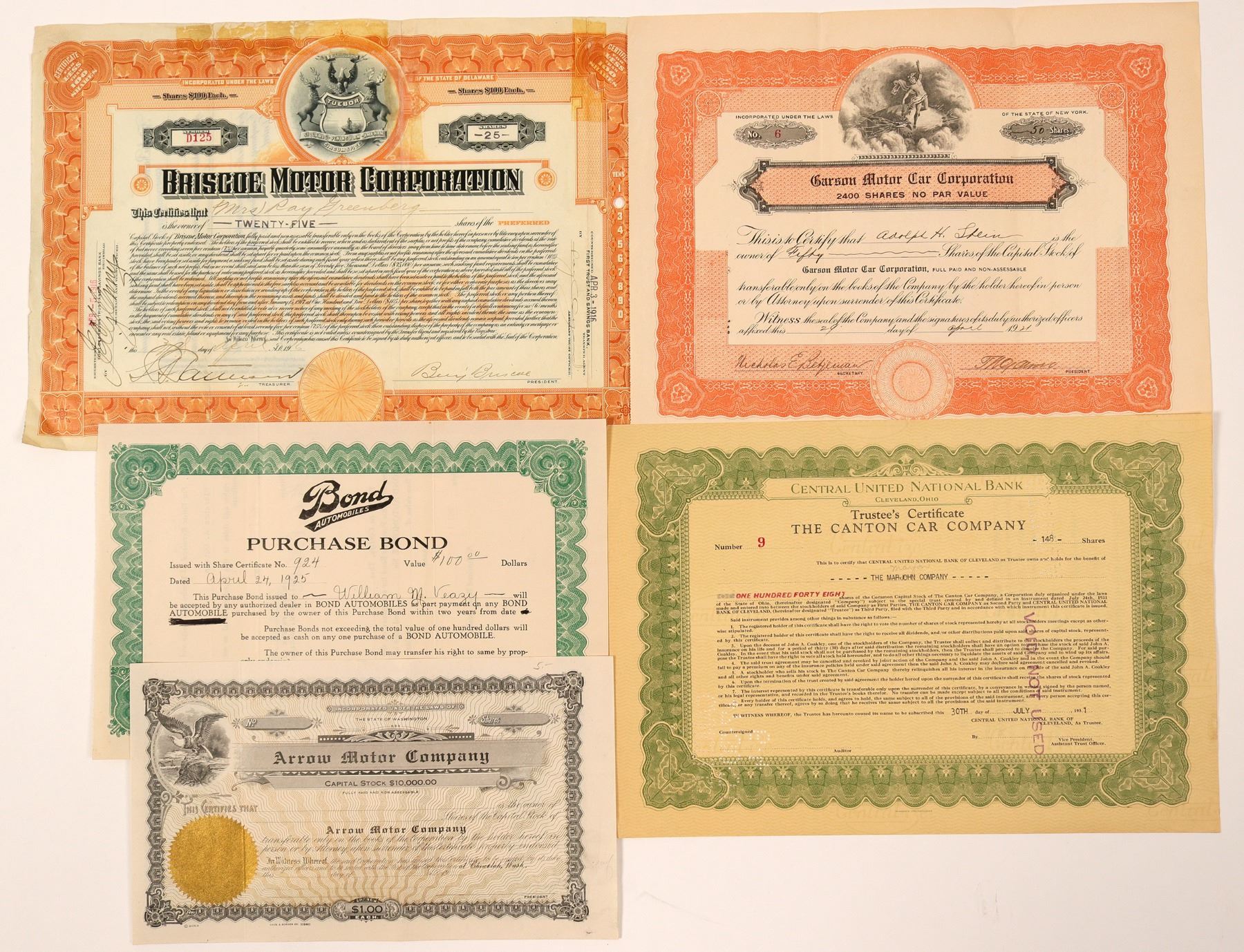 Lot of five. 1) Briscoe Motor Corporation. # D125 for 25 shares to Mrs. Ray Greenberg. Signed by president Briscoe (namesake). Seal vignette. During the early years of the American automobile industry, there was a manufacturing plant in Jackson, Michigan for the New York City-based Briscoe Motor Corporation, which produced cars between 1914 and 1921. The company made its debut near its corporate office at the New York Automobile Show in January 1914. The Briscoe automobiles were powered by a four-cylinder L-head engine that produced 33 horsepower and offered a medium to high price tag. The Briscoe was a very light car, except for the cyclops headlight design that stared out of the radiator grille. For many consumers at the time, the car was new, and most people had never heard of the Briscoe Motor Corporation. The car was named for Benjamin Briscoe, who was born in Detroit and an automotive pioneer and industrialist. In 1904, Briscoe joined with Jonathan Maxwell to manufacture the Maxwell-Briscoe automobile. In 1914 and 1915, the Briscoe automobile offered the consumer a four-cylinder engine and a lightweight body made of a composition paper mache material. [Hiroian Robert Tate.] 2 Canton Car Company. Very early number 9 for 148 shares to the Marjhohn Company. Stamped void, not used. 1931. 3) Bond Automobiles. # 506. Issued with share certificate # 924. 924 for $100. Rare purchase bond. 4) Garson Motor Car Corporation. Very early number 6 for 50 shares to Adolph Stein. Singed by Beteman and president Moore. Dateline and incorporated 1921. 5) Unissued Arrow Motor Company stock datelined Chewelah, Washington. Ken Prag Collection