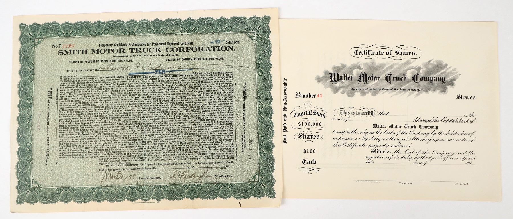 Lot of 2 different. 1) Smith Motor Truck Corporation, 1917, temporary certificate. 2) Walter Motor Truck Company (unissued, 1910s).