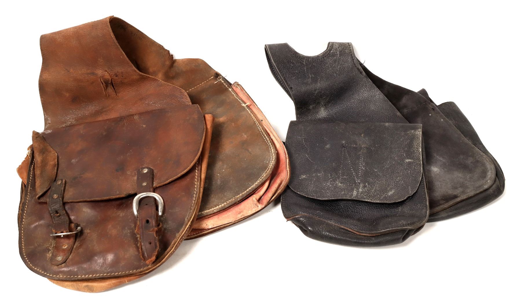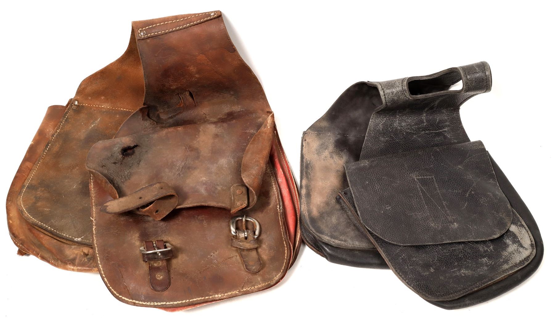 This lot has two sets of saddlebags for vintage motorcycles. The black leather pair measures 10 in.X 11 in. with Velcro closures and a angled top for possibly straddling a hardtail frame or similar soft-tail designed frame. The brown leather pair are 11in. X 12 in. with a flat curve top and metal buckle fasteners. The leather is dried and weather stained on this pair. Please see photos for details.