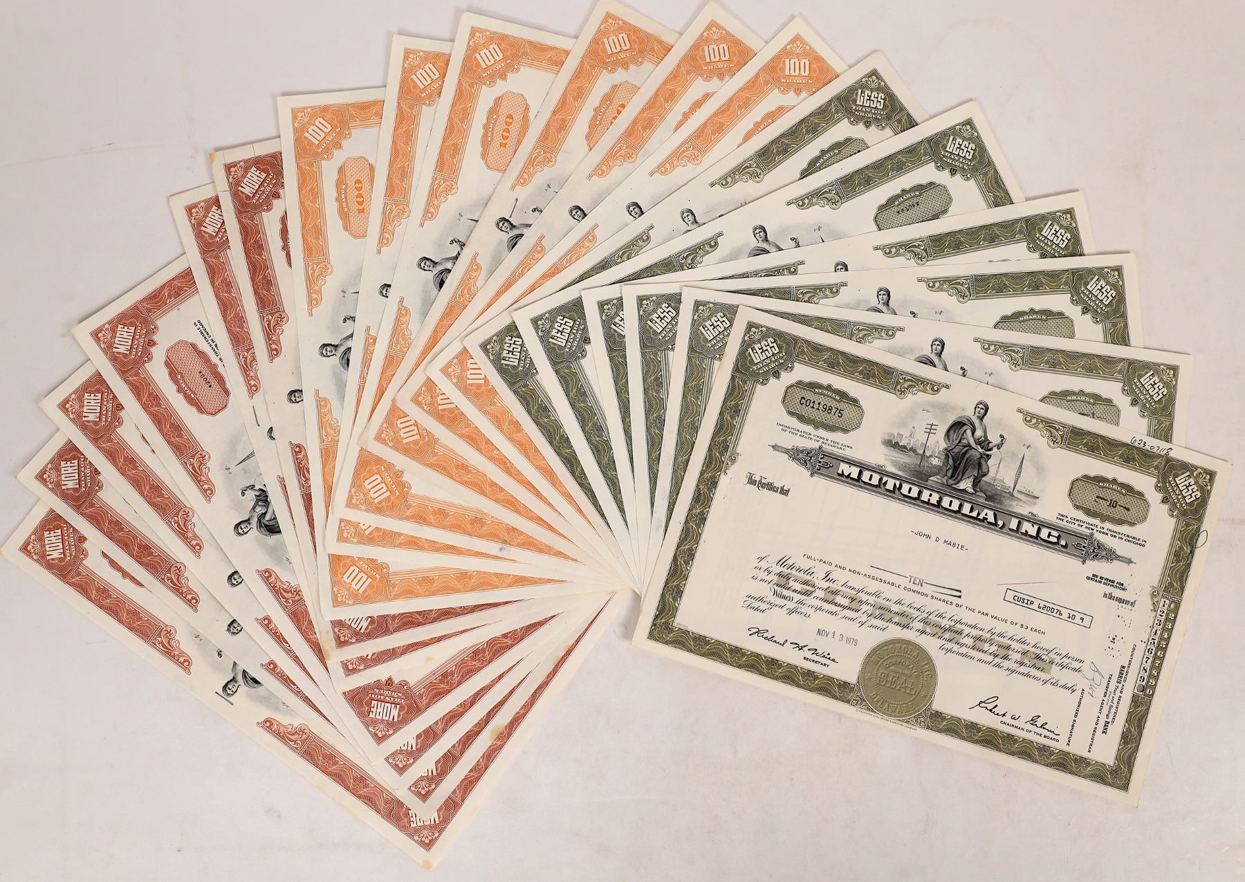 Group of 18 Motorola, Inc. stock certificates, three different, 6 each, c1971-80. Please see photo(s) for more details. Ken Prag Collection