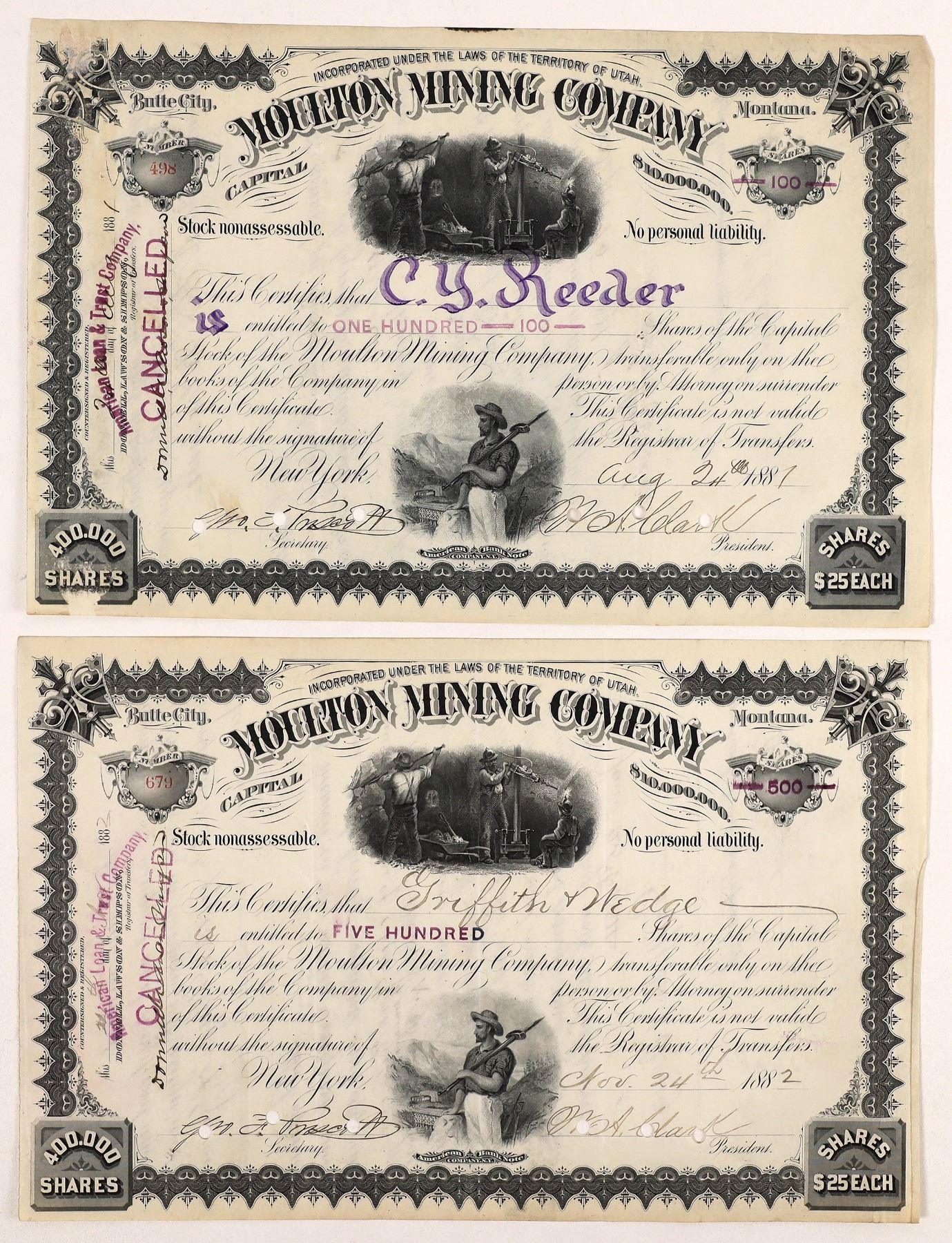 Lot of 2 stocks issued in 1881 and 1882. Both signed by WA Clark as president. Punch cancelled signatures. Black border and print, mining and agricultural vignettes, ABN. Clark is one of the "Copper King" mining millionaires of Montana. He also served as a US Senator for Montana from 1901-07.