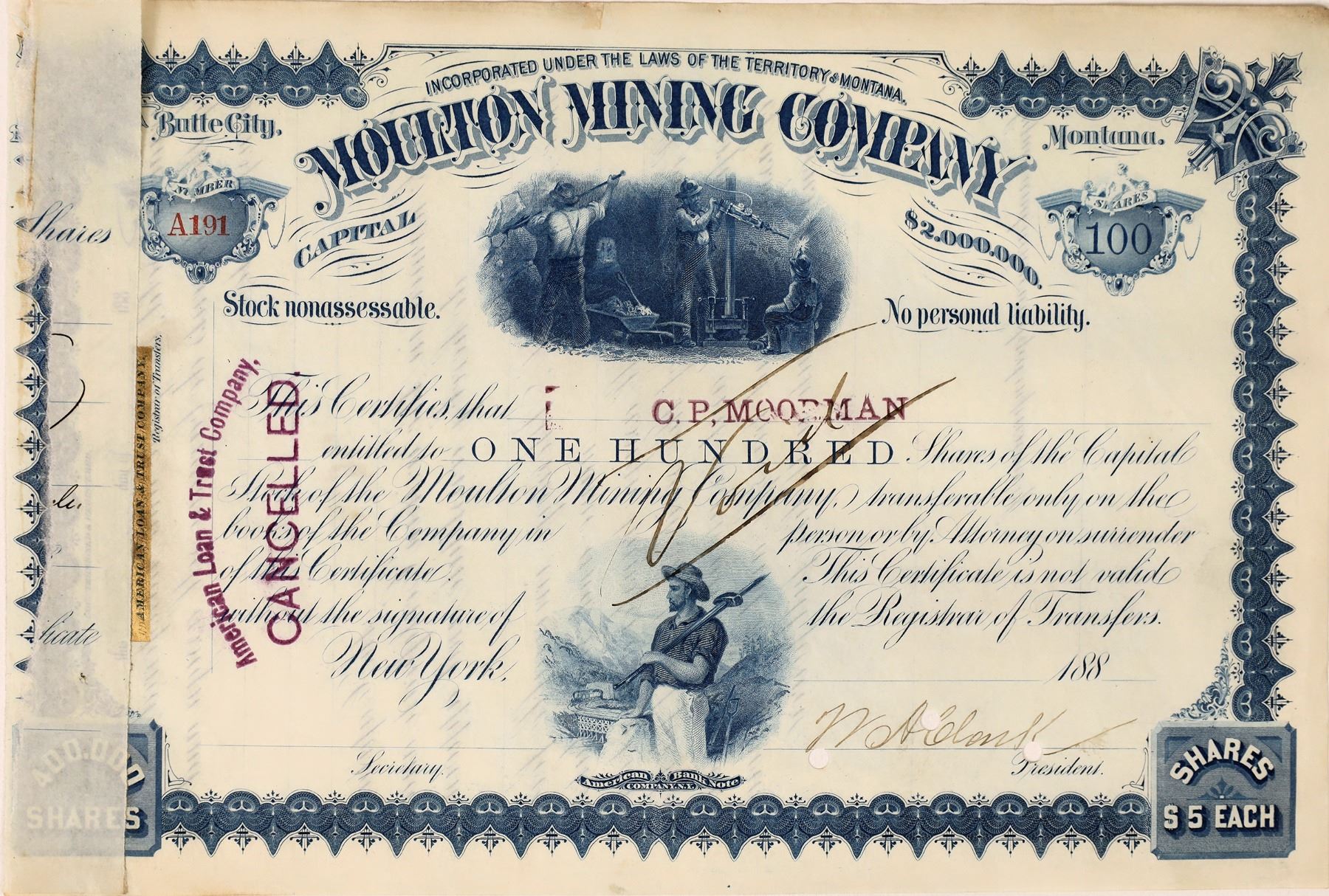 Stock A191 issued to CP Moorman for 100 shares. Not dated or endorsed. Signed by WA Clark as president. Clark was one of the Copper King mining millionaires of Montana, and also served as US Senator for Montana. CP Moorman became associated with the JH Cutter celebrated whiskey firm in Louisville in 1858. When Cutter died in 1860, Moorman and his silent partner MJ Hardy bought the brand for $1,900. Nice companion piece for your whiskey bottle!