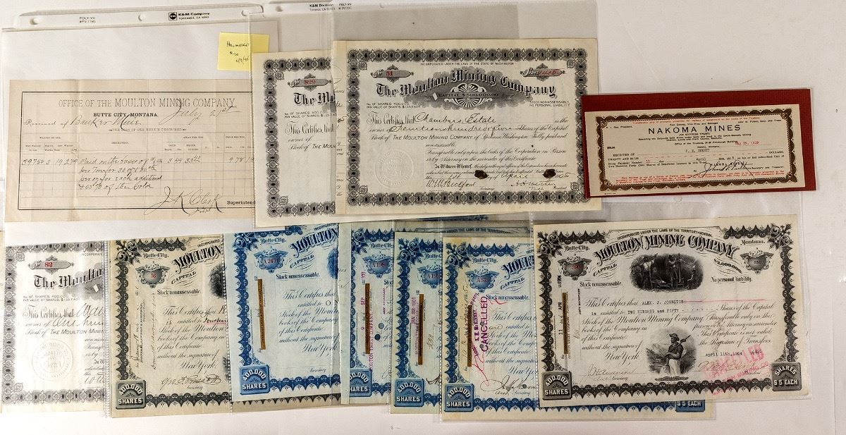 13 Moulton Mining Company stocks. William Andrews Clark, president. Collection assembled when the stocks were first released--almost impossible to do today. Color, denomination and signature varieties. Dated from 1881-1905. Great group. City: State: Montana Date: ID: 36266