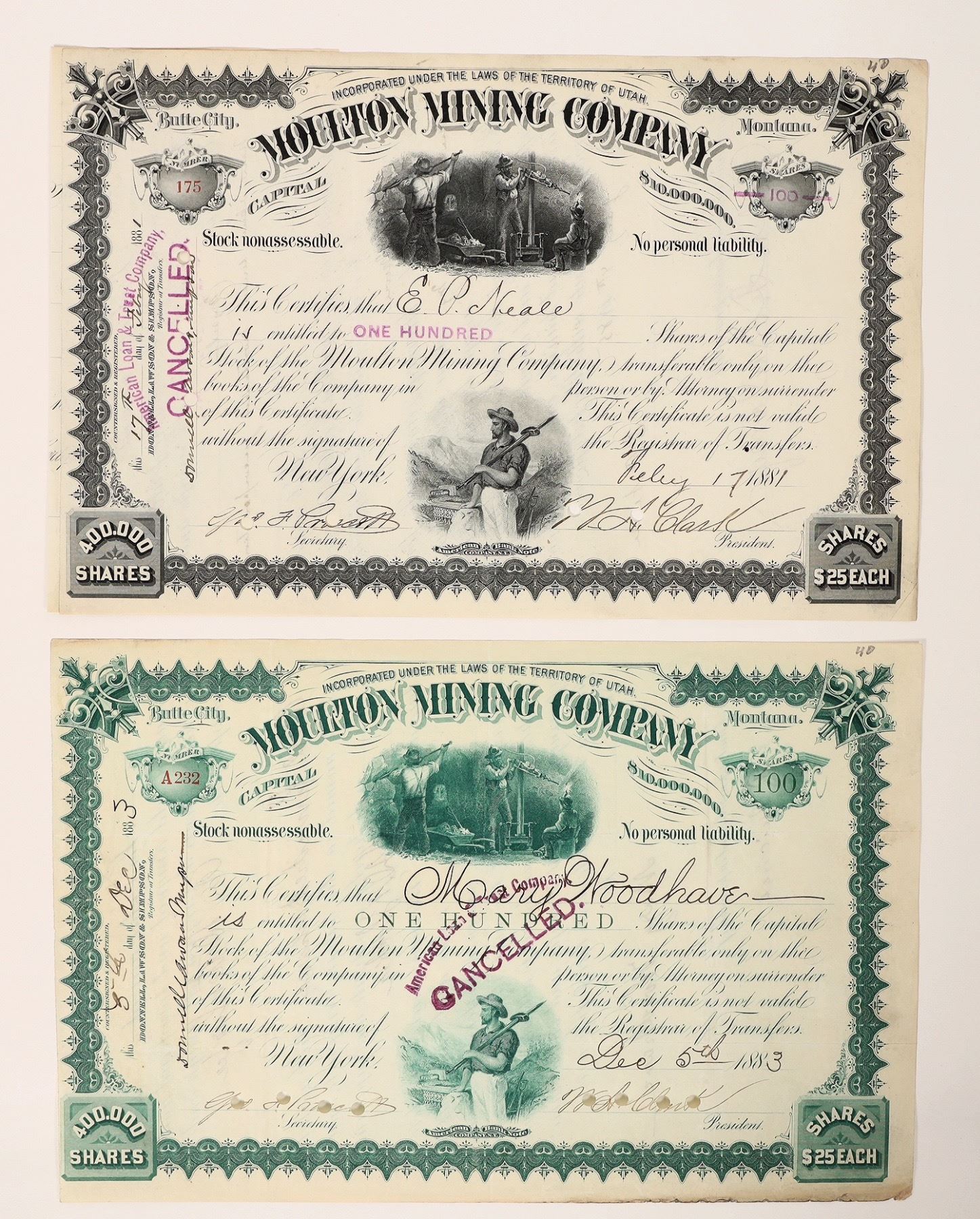 Issued 1881 and 1883 Moulton Mining stock with W A Clark signatures. Clark was involved with mining, banking, railroads and politics.[ Butte City Montana