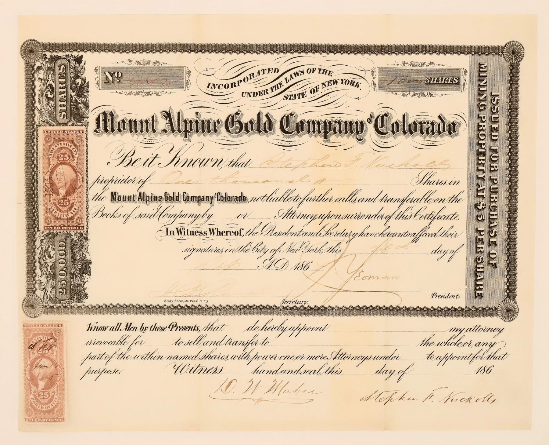 Mount Alpine Gold Company stock certificate - Griffith District, Georgetown, Colorado Territory, c1864. No. 442, 1000 shares, signed by J. Yeoman, president and T.B. Randol, secretary, Sept. 28, 1864. Inc. in N.Y.. R44 R4 red 25-cent certificate revenue stamp and an R48 R4 red 25-cent power of attorney revenue stamp. A very early Colorado mining certificate and one of the earliest from the Georgetown area. Witnessed by D.N. Maber and Stephen F. Nicholl. Printer is Henry Spear 133 Pearl St. N.Y. In very good to excellent condition. - Fenske Collection. Comes with detailed history of the company.
