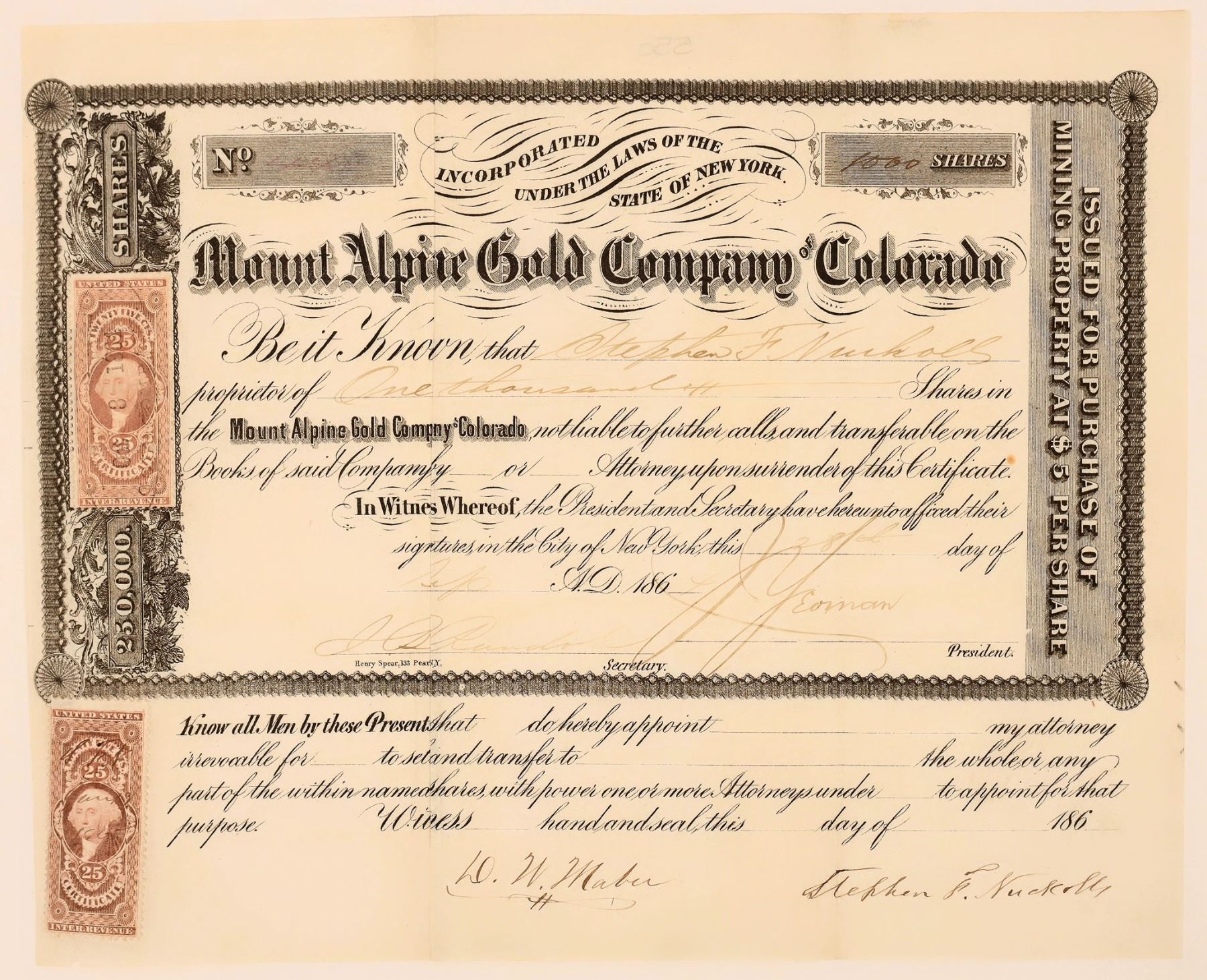 Mount Alpine Gold Company of Colorado stock certificate. Issued to Stephen F. Nuckolls on Sept. 28, 1864, No. 445, 1,000 shares. Two 25-cent revenue stamps on left border. Signed by president J. Yeoman and secretary J. Randall. Nuckolls signed at bottom, and D.W. Maber. The company operated in the Griffith Mining District, Empire, Clear Creek County, Colorado. It was incorporated in New York.