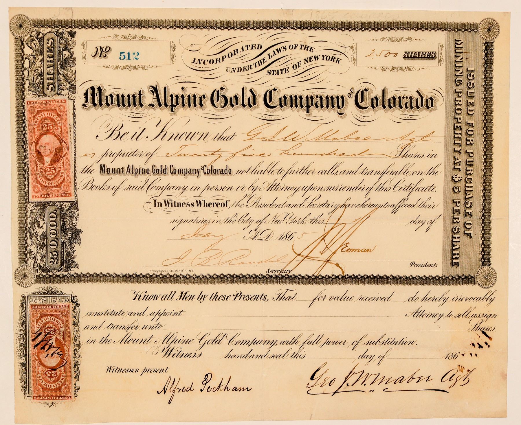 Early! Inc. in New York. No. 512, issued for 2,500 shares to Geo. Mabee, agent, on Jan. 11th, 1865. Signed by the president (Groman?) and secretary J. Randall. Not cancelled. Black border and print. Two 25 cent adhesive revenue stamps attached on the left border. 8 x 9.75" Pinholes, folds, other light wear. The company operated in the Griffith Mining District, Empire, Clear Creek County, Colorado. Hollister notes they have a "large, handsome" 24 stamp mill and have done work on the Griffith, Corisannie and other lodes. They have reorganized as "The What Cheer." Represented by Col. William M. Hale of Providence. [Ref: Hollister, 1867, pg. 251] () Ken Prag Collection