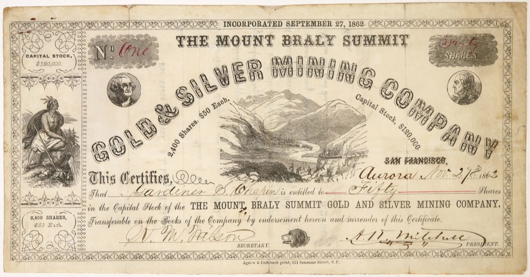# 1 for 50 shares to Gardiner S Chapin. Signed by RM Wilson and president A Mitchell. Dateline Aurora (San Francisco is scratched out) on November 27, 1862. Esmeralda Mining District. Incorporated September 27, 1862. 25c Revenue Stamp on back. Not cancelled. Vignette of miners working above a valley being traversed by a river and train. Also Native Americans vignette. Small pictures of Washington and Franklin. Agnew & Deffeback printer. Small tape repairs, staining, etc. Very good. Very unique # 1. Very unique location: Mount Braly. Very rare! This is a desirable pre-1863 certificate. Wilson was Mono County's frist recorder and clerk. Mitchell was a soldier involved in the Mormon War and the first Pyamid Lake Indian Battle. Short bios on Wilson, Mitchell and Braly (namesake) and reference to an article in the Daily Alta California. City:Aurora, Esmeralda Co. State:Nevada Date:1862