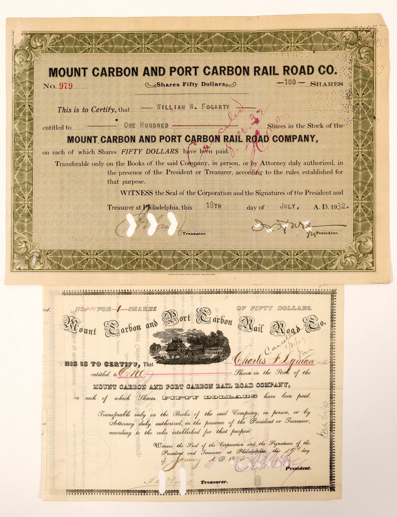 #430 ,I/C, for 1 share of common stock @ $50 par, issued Jan19, 1893, singed but not readable (cancel punch holes), black, embossed seal, vignette top open ab train l-r passing lake under wavy title, printer unknown. EF