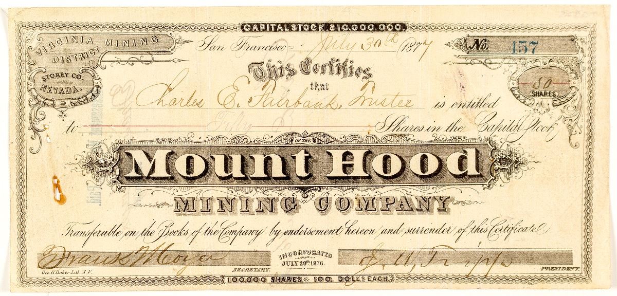 Cert. #457, issued to Charles E. Fairbank, Trustee in 1877 for 50 shares. Signed by J.W. Tripp as president. Virginia Mining District printed in top left corner. The Mount Hood is one of the more scarce certificates from the Comstock. Small rust hole at left. VF. Uncancelled. City: Virginia City State: Nevada Date: 1877 hwac# 35403