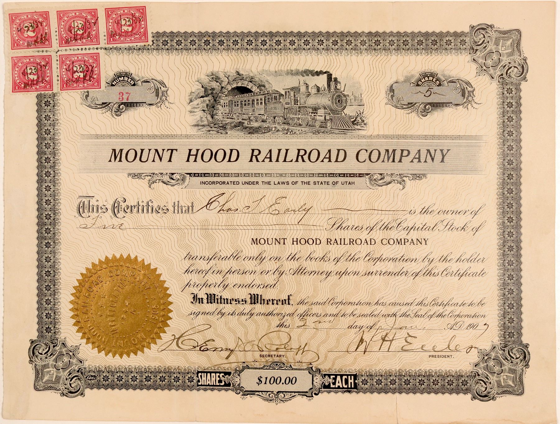 #37, I/U, 5 shares @ $100 par. Issued Jan 2, 1907. BLACK, gold embossed seal, vignette 4-4-0 passenger train exiting tunnel. 5 documentary stamps upper left. GOES printer. VF Ken Prag Collection