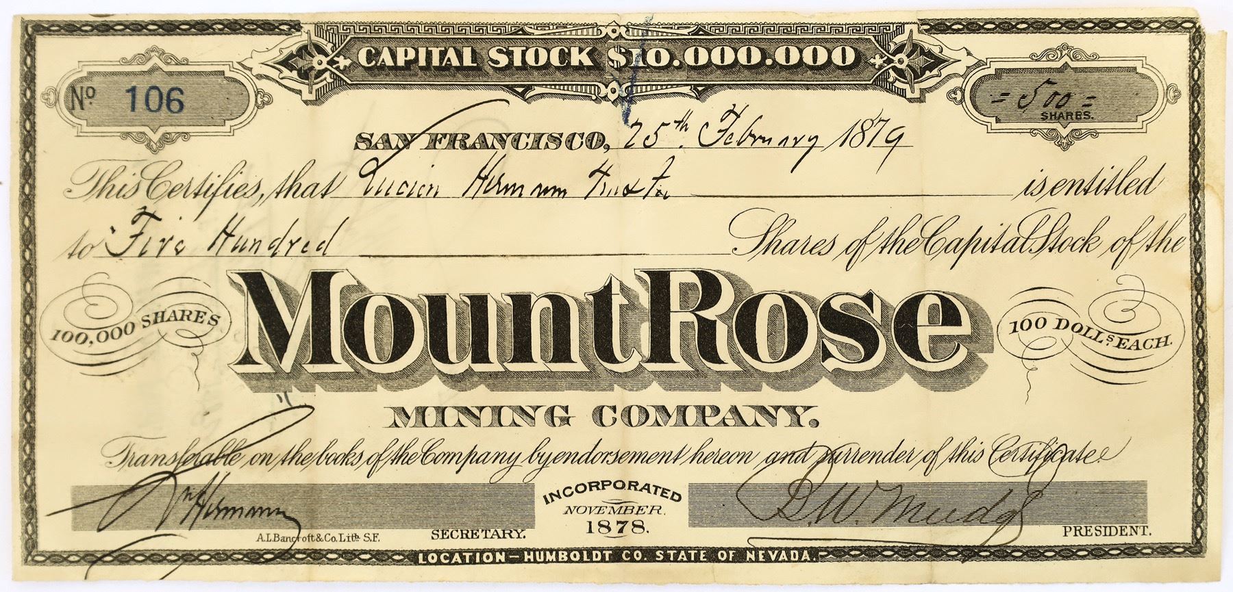 Location: Mount Rose Mining District, Humboldt Co., State of Nevada. # 106 for 500 shares issued to the company secretary on February 25, 1879 in San Francisco. Incorporated November 1878. Signed by president B. W. Mudge (mining president) and the secretary Lucien Hermman (secretary). Not cancelled. Black border and print. Printed by AL Bancroft & Co., SF. Pinholes, folds, creases, missing upper right corner. Overall very good. The Mount Rose District is on the north edge of Paradise Valley. 1 page description containing an 1879 eye witness look at the Mount Rose District. Mining was done in the Red Hills on the north side of Paradise Valley. The company was formed in 1878. The Mount Rose Mining District of Humboldt County was discovered in 1868, organized in 1873, with Spring City the central mining camp. [Ref: Tingley] Short description of Spring City.