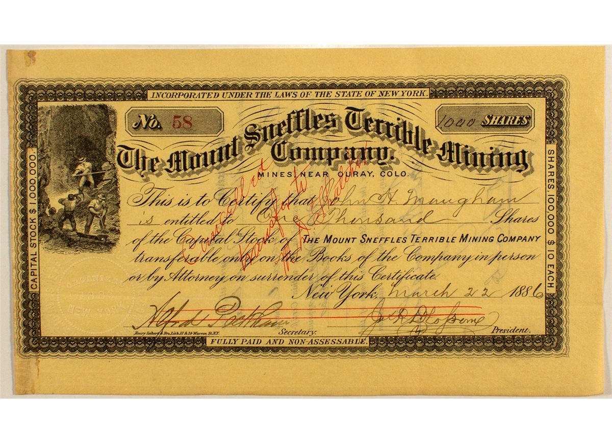 Ouray. Sneffles district. Inc. in New York in 1883. Dateline New York, March 22, 1886. No. 58. Pen cancelled. Issued for 1000 shares to John H. Maugham. Signed by company president and secretary (names illegible). Certificate states “Mines near Ouray, Colo.” Vignette at upper left of three miners working underground. Reverse is endorsed. Black border and print on yellow paper. Measures 5” x 8.” Printer Henry Seibert & Bro., NY. The boom years of the Sneffles district were between 1881 and 1919 during which time it produced an estimated $27 million. As many as 3000 people were employed in the district during those years. This company was formed from the consolidation of the San Juan Terrible and other mining companies and claims [ref: Eberhart, pp. 364-365]. Condition: soiling along left edge, otherwise nice certificate.City: OurayCounty: SnefflesState: CODate: