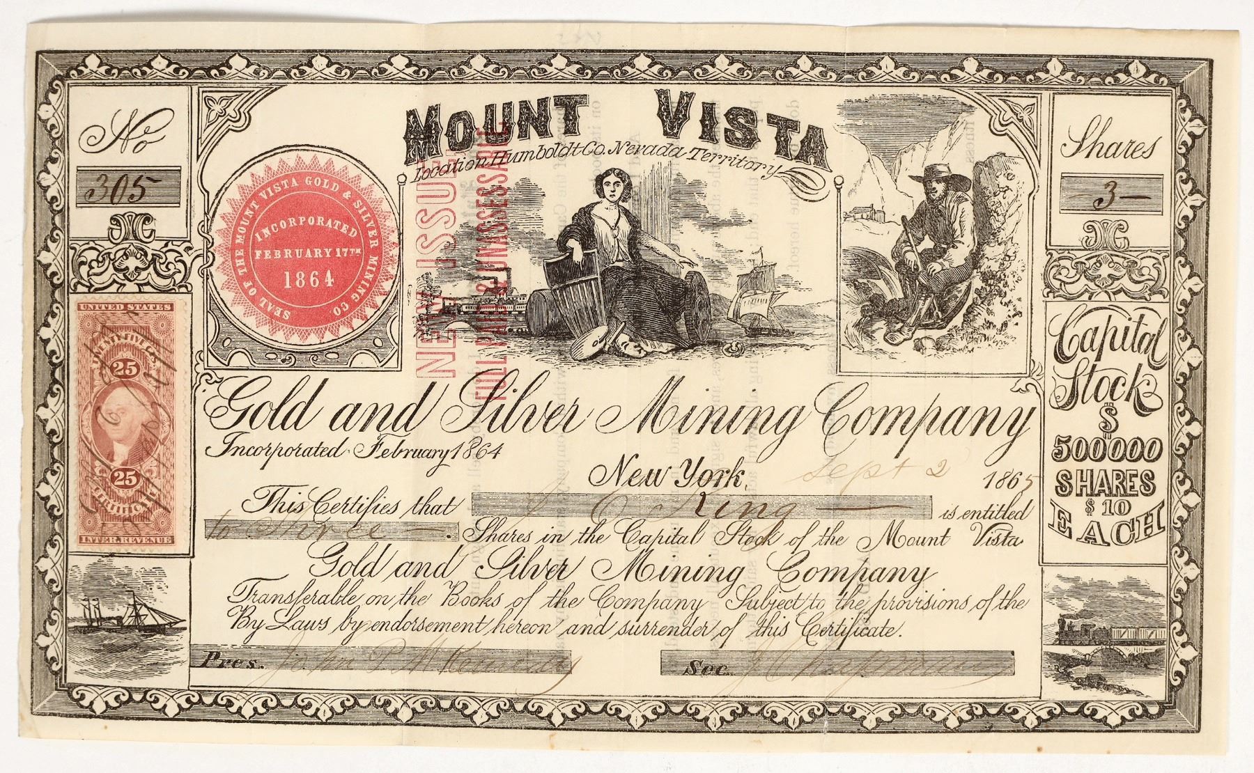 Fabulous and rare. We only sold one of these in the Prag Collection. "Location Humboldt Co. Nevada Territory" (printed under title). Inc. Feb. 1864. No. 305, issued for 3 shares to JE King in New York on Sept. 2nd, 1865. Signed by president John PM Kennedy and secretary J. Chapman. Not cancelled. Very attractive design with red seal, ornate border, and four vignettes: miner, allegorical woman, train crossing a bridge, and paddlewheel steamship. 25 cent US IR stamp attached at left. Folds, creases. 5.5 x 9.5" The mine was located on the Detroit Ledge, Buena Vista Mining District, Unionville, Humboldt County, Nevada.