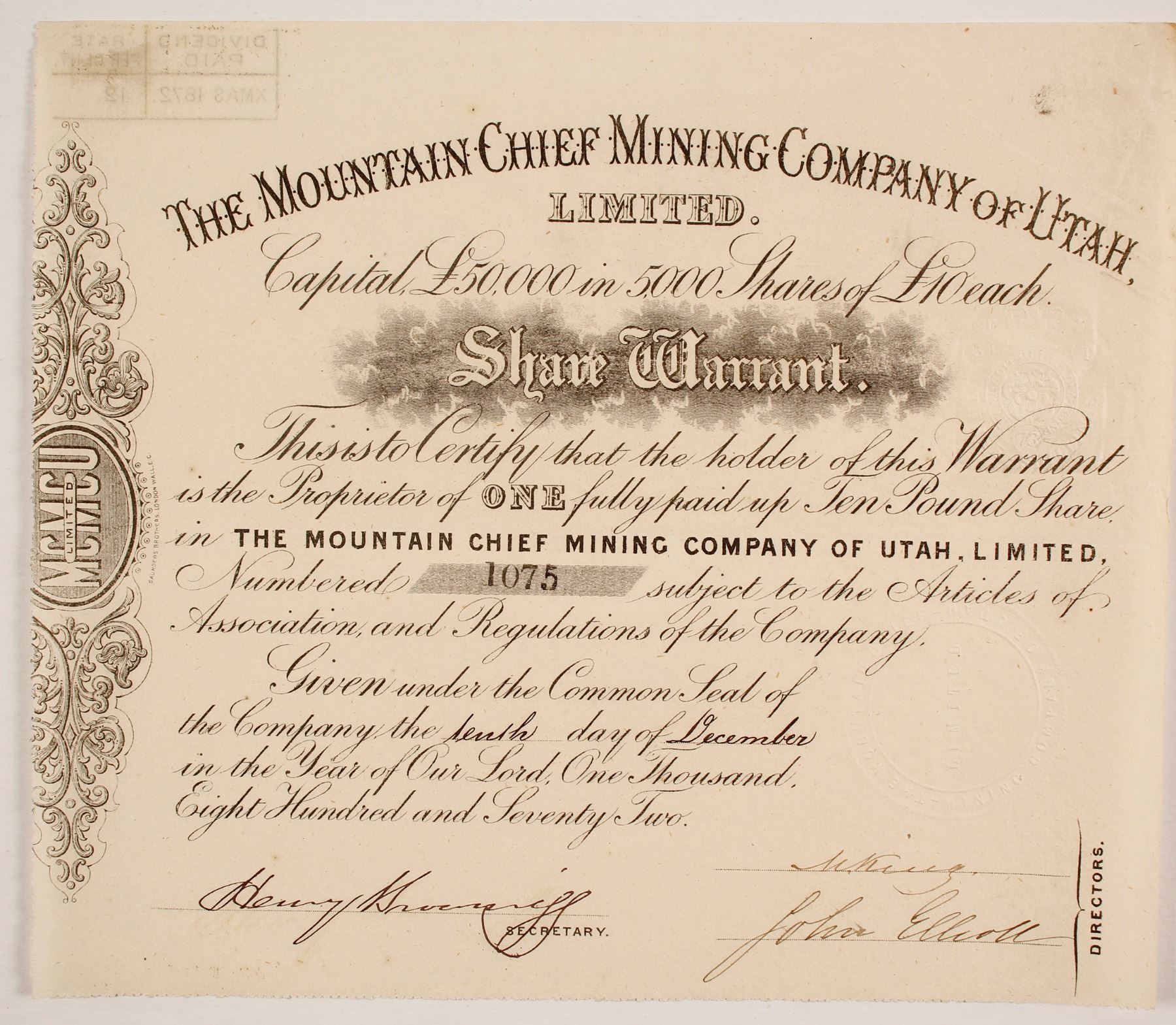English investors. # 1075 for 1 share. 1872. "Share Warrant" Top eft dog ear, wrinkles and one spot upper right. Nice. State: Utah City: Tutsegubet District Date: 1872