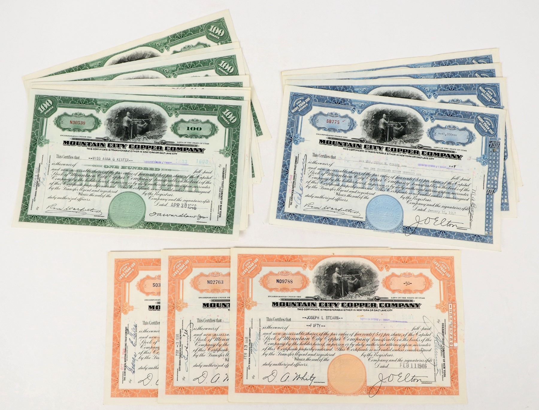 15 Mountain City Copper Company Stocks c.1943-46. 3 Varieties; green, orange and blue. See photos.