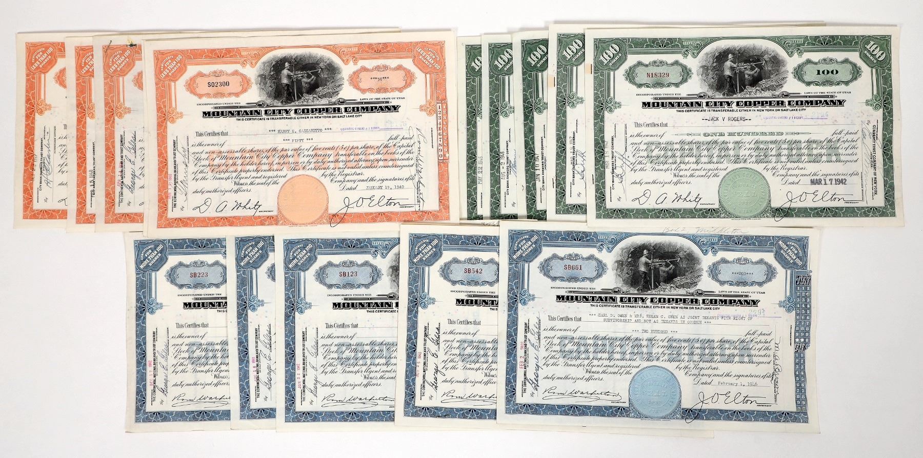 3 different Mountain City Copper stocks. 5 each blue, green and orange. 1938-47.
