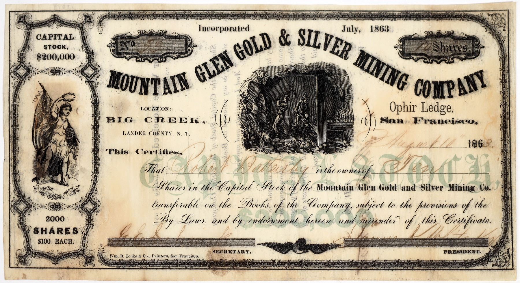 Cert. #33, issued for 10 shares to Robt. Battersby in 1863 and signed by James K. Whitaker as president and G. E. Schenck as secretary. Vignette of two miners working underground. Vignette by Loomis - one of San Francisco's finest mining stock certificate lithographers. Location: Big Creek, Lander County, N.T. printed left of the vignette and Ophir Ledge printed to the right. Green underprint says, Capital Stock- $200,000. Rare printer: William B. Cooke & Co., San Francisco. Big Creek is 14 miles southwest of Austin. The district started in 1863 and prospered until 1866, when the ore ran out (Paher). Black print on pink tinted paper. Rare. Uncancelled. Battersby was a prospector and promoter of the area in 1863. He had a canyon near Big Creek named for him, although I could find no information on it other than an article in the Reese River Reveille. Mine was actually in the Mount Hope Mining District. Research on the Mount Hope district and a biography on Battersby