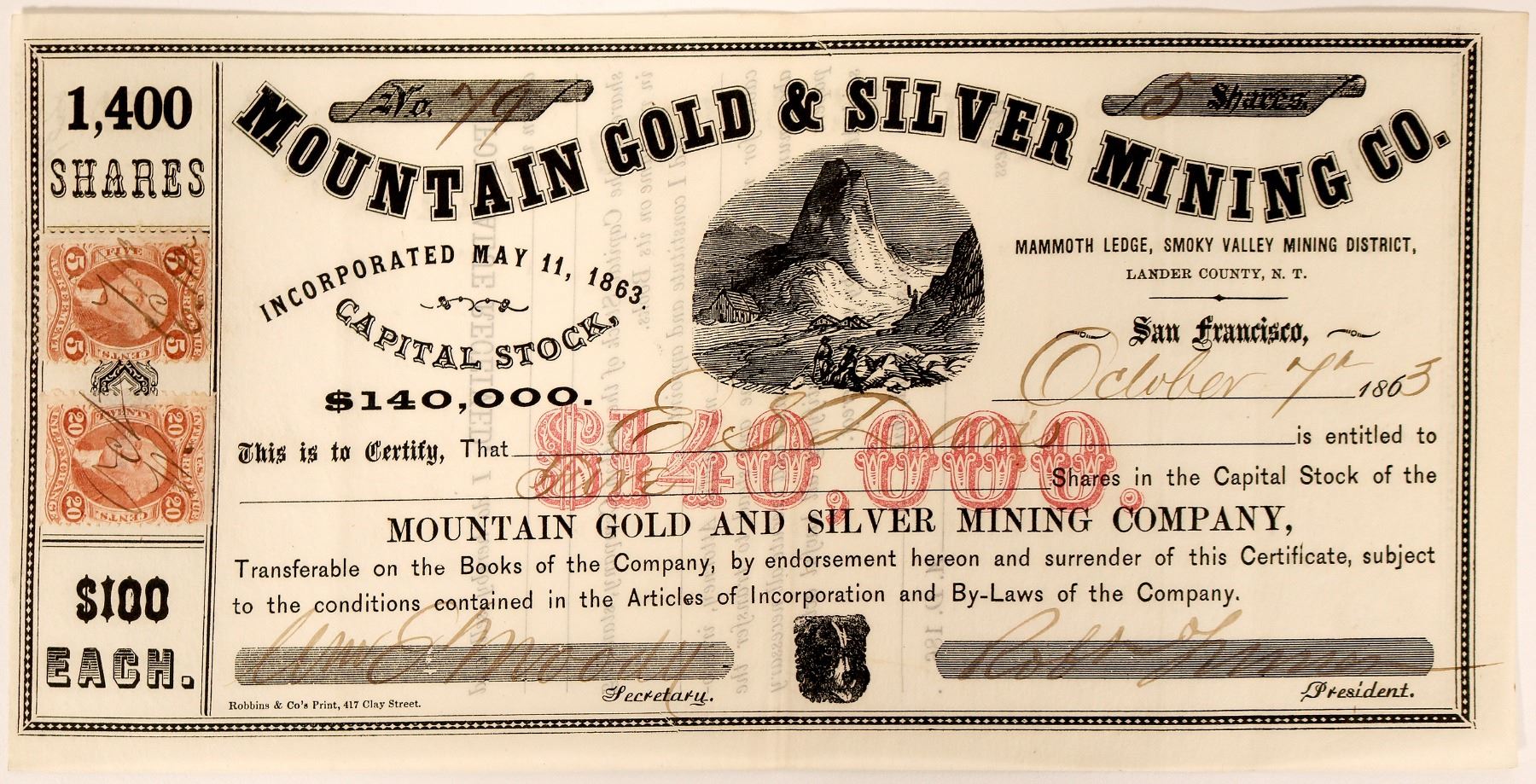 # 79 for 5 shares to ES Davis. Signed by William Moody and president Robert Turner. Dateline San Francisco 1863. Incorporated May 11, 1863. Not cancelled. Small 5c and 20c revenue stamps. Loomis vignette of miner and miner's cabins in front of a towering mountain. Underprint '$140,000.' Robbins & Co. printer. Location: Mammoth Ledge, Smoky Valley Mining District, Lander County N. T. No edge, corner, pin hole or discoloration issues. Wonderful! We found no information on this company. The large Smoky Valley district which took in all of the eastern slope of the Toiyabe Range. More commonly called the Kinston District. Ken Prag Collection