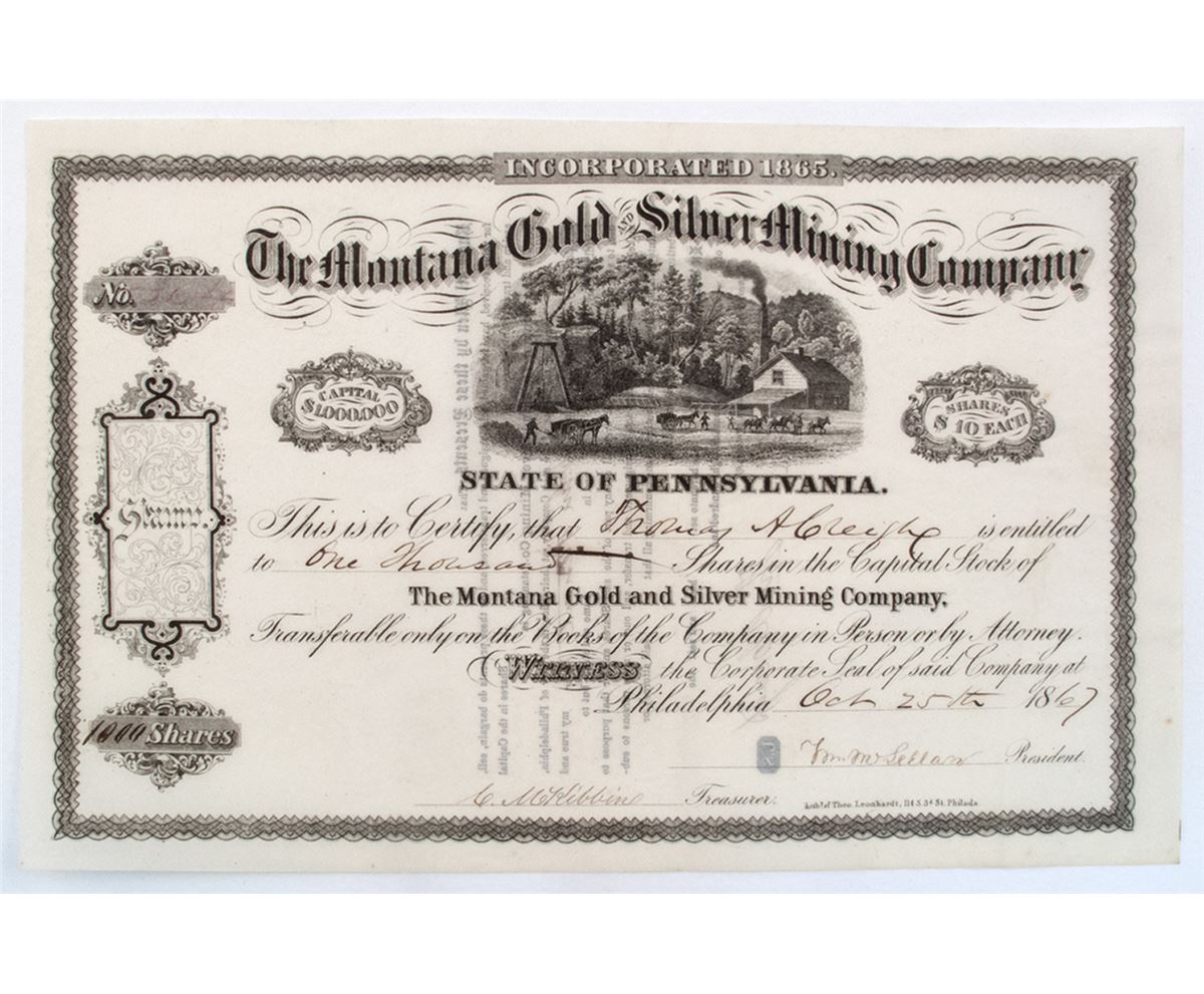 The Montana Gold And Silver Mining Company was listed on the Philadelphia Stock Exchange. Attractive document. Chartered by the state of PA March 23, 1865. Stock certificate 5364 for 1000 shares to Thomas A Creigh in 1867. Signed by William McClellan, president and CM Kibbins, Treasurer. Vignette of hoisting works. and mill. The company built a quartz mill and a one-story residence in Spring Gulch, Summit District in 1866. [Ref: http://deq.mt.gov/abandonedmines/linkdocs/129tech.mcpx]