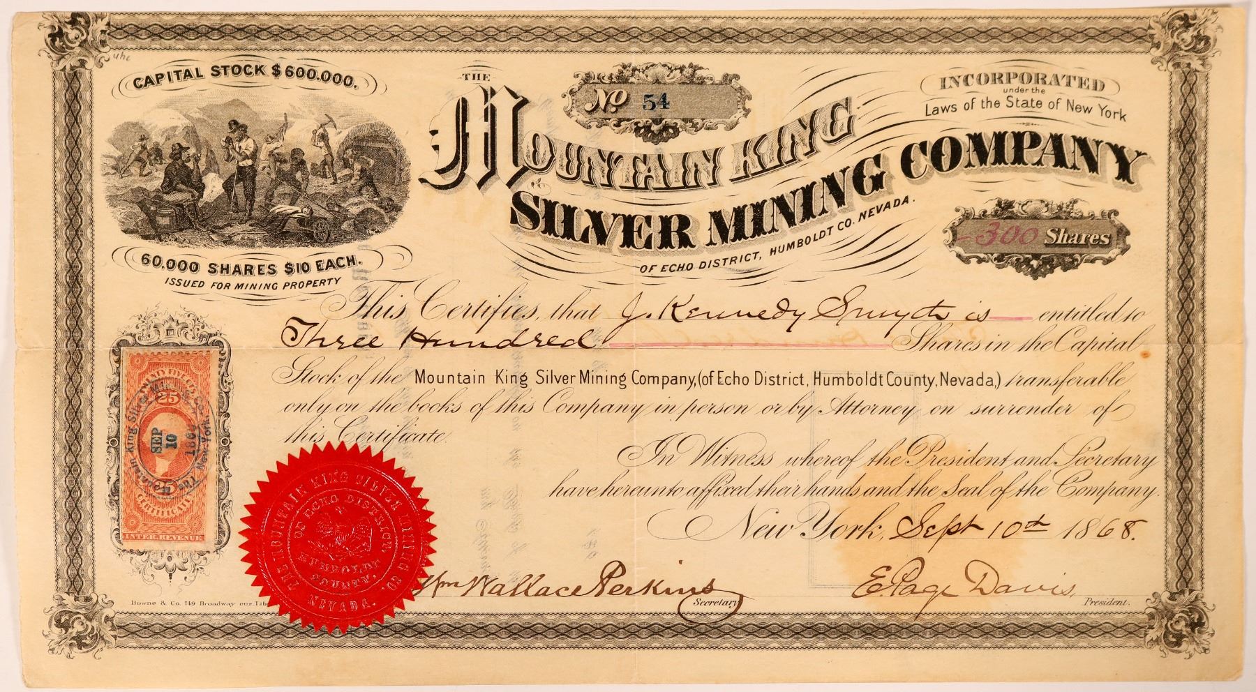 Very nice stock certificate #54 issued in 1868 from The Mountain King Silver Mining Co. of Echo District, Humboldt Co, Nevada. Issued for 300 share to J. Kennedy Smyth and signed by E. Page Davis as president, and Wm. Wallace Perkins as secretary. Nice vignette of a group of miners working above ground at top left. Black on white with red seal. 25c Revenue stamp at bottom left. Shares were $10 Each. Total capital $600,000. The certificate has been folded in fourths. Tight top edge trim. Uncancelled. Not in Filer. Rare.