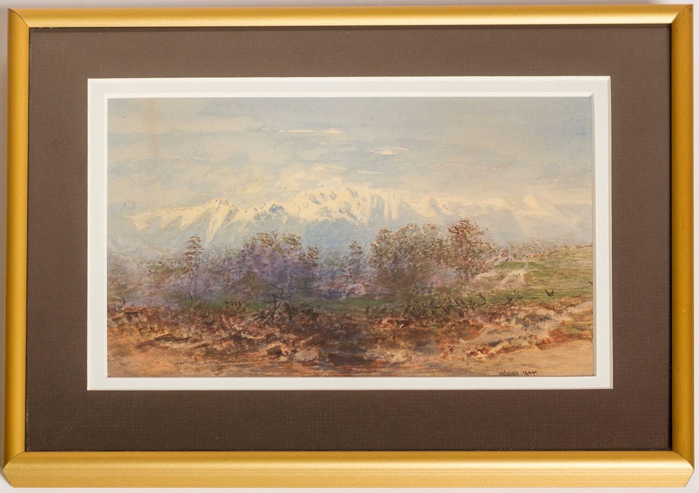 Oil on canvas painting of snowy mountain range with trees in foreground. Signed by the artist, Otto Reinhold Jacobi, and dated 1877 (5). Brass frame, 8.5 x 11 inches. Jacobi was born in Konigsberg in 1812. In 1837 he was appointed as the Court Painter to the Duchess of Nassau in Wiesbaden, Germany. Jacobi emigrated to Canada in the 1860s where he was consigned to paint a presentation gift for the Prince of Wales; he never returned to Europe, choosing to remain in Canada. Jacobi was associated with the Dusseldorf School of Painting, the Ontario Society of Artists, and a charter member of the Royal Academy of Artists. He relocated to Ardoch, North Dakota, where he was residing at the time of this death in February 1901. Provenance: From the historical Ben-Tcahvtchavadze Collection of Ontario, Canada. Date: Location: Ontarior, zCanada HWAC# 56003